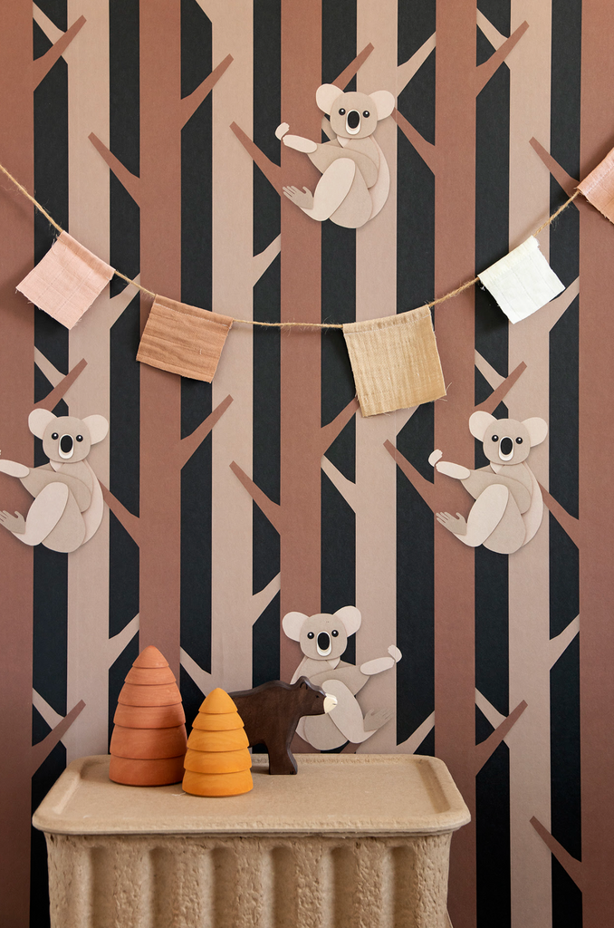 The new wallpaper with friendly koalas is available in 2 colors; choco and nougat. The cute koala bears have climbed high in the trees. Together with the trees, they form a beautiful pallet of warm natural colors. It's the perfect wallpaper for an animal lover's nursery.