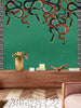 Mural Size 153" x 110" - 3 Smaller Sizes Available Make a statement in the living room, hallway or bathroom with our striking mural ‘Emerald Green Snakes’. The emerald green hand-painted background color gives a lively effect with the red snakes, finished with a subtly striped band. This mural is an original work of a