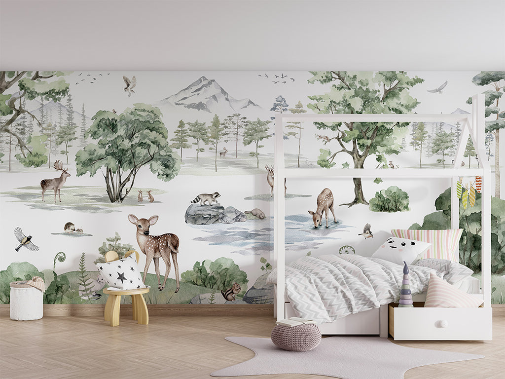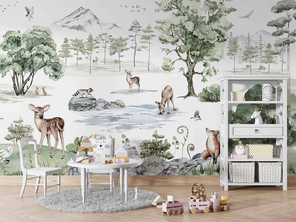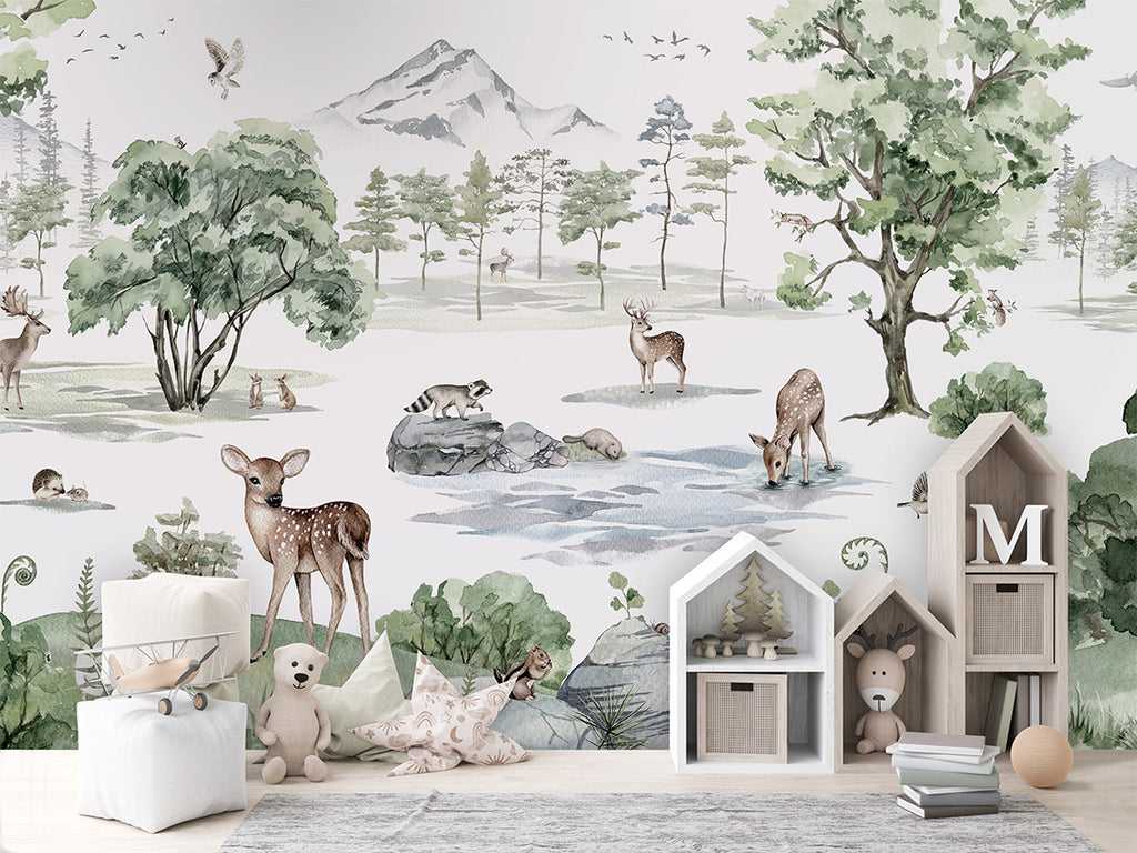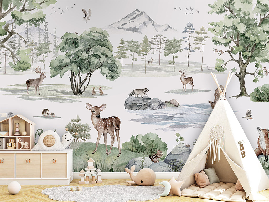 The Wildlife Deer Forest Mural by Fentucci features graceful deer amid a serene woodland scene with soft, muted tones evoking nature’s calm. Perfect for bringing tranquility and elegance to any space. #luxurywallcoverings #natureinspireddesign #elegantinteriors