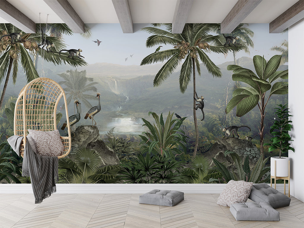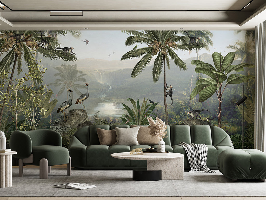 Lush botanicals, exotic birds, and playful monkeys come to life in the Monkey Sanctuary Mural by Sir Edward. A whimsical escape. #luxuryinteriors #muralart #statementwalls