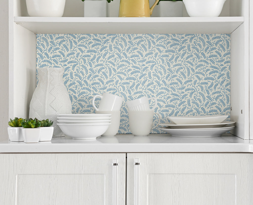 Delicate botanical motifs in soft bleu bisque create a serene, country-inspired backdrop. Elegant and timeless. #luxuryinteriors #wallart #homedecorstyle