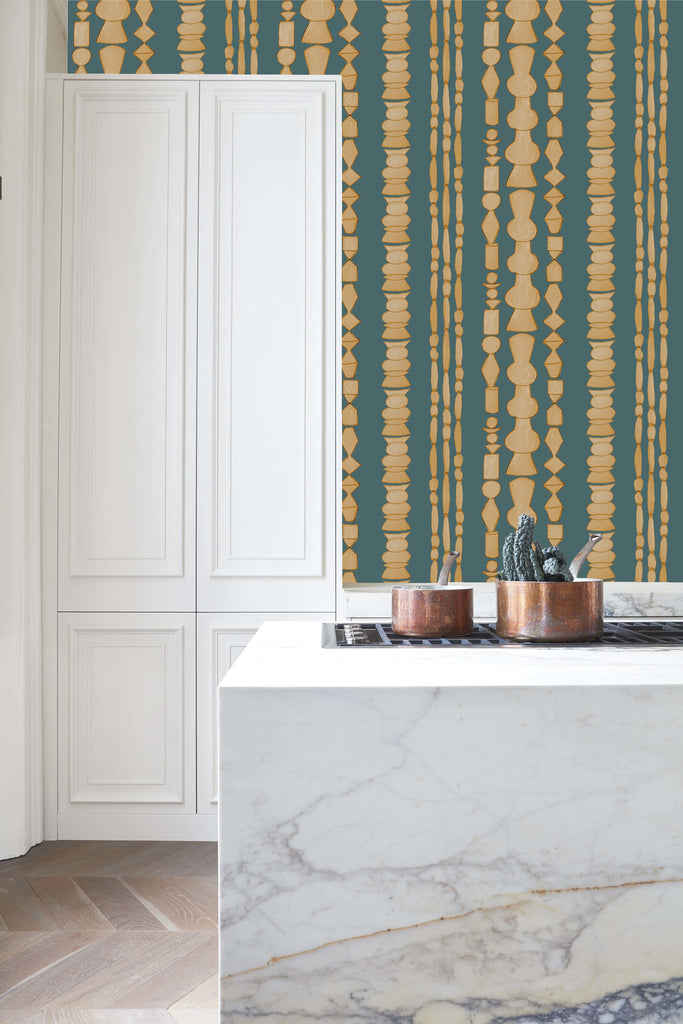 Heaps Sling Blue Wallpaper | Catchii Netherlands Europe A combination of iconic design and the love for rattan and wooden furniture, all stacked together to form a sling. We have created a pattern to ensure it becomes a statement wallpaper.