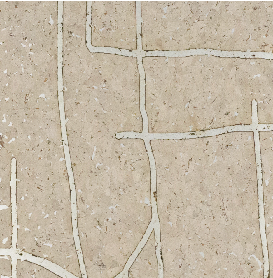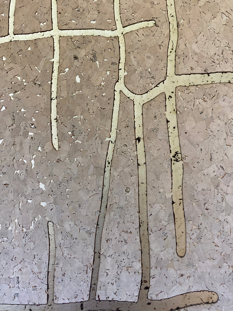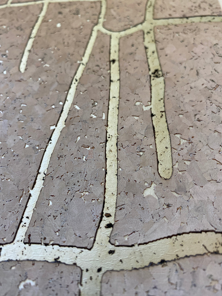 A playful abstraction, Mr Miyago’s explores line and connection with a new technique for cork wallcoverings — laser cutting. Surface dyed sheets of natural cork are first laser cut, then backed with metallic foil to highlight the line work. Laser cutting burns the material, creating a dark outline. Mr Miyago installs as a partial match or non-match in a gorgeous fluid pattern that becomes the focal point of a space.