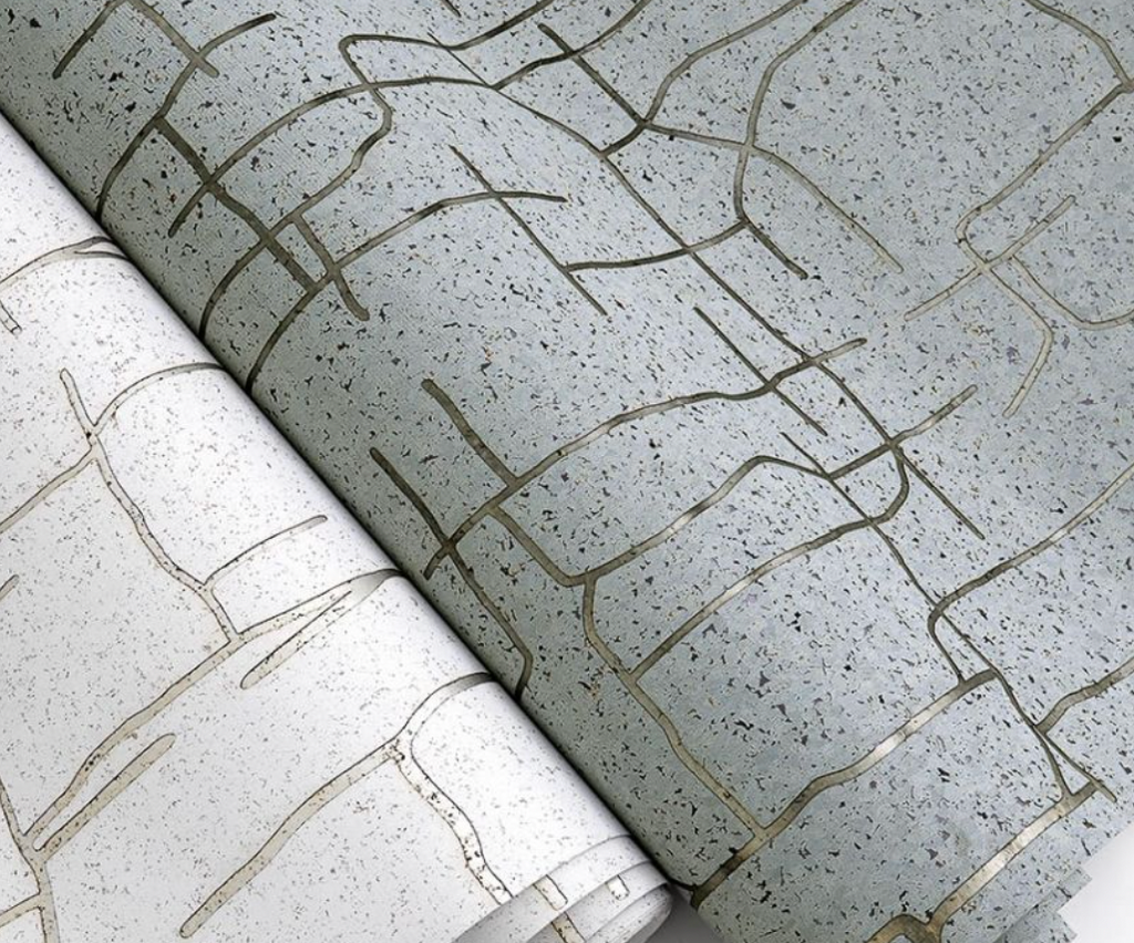 A playful abstraction, Mr Miyago’s explores line and connection with a new technique for cork wallcoverings — laser cutting. Surface dyed sheets of natural cork are first laser cut, then backed with metallic foil to highlight the line work. Laser cutting burns the material, creating a dark outline. Mr Miyago installs as a partial match or non-match in a gorgeous fluid pattern that becomes the focal point of a space.