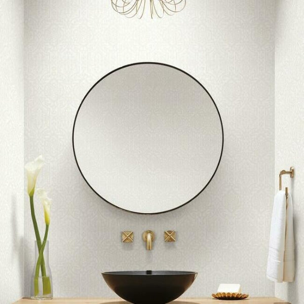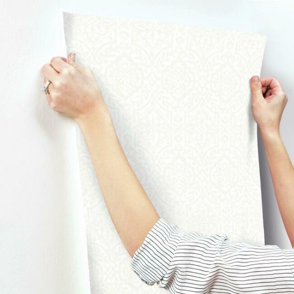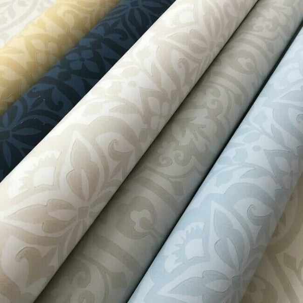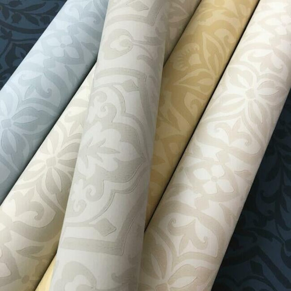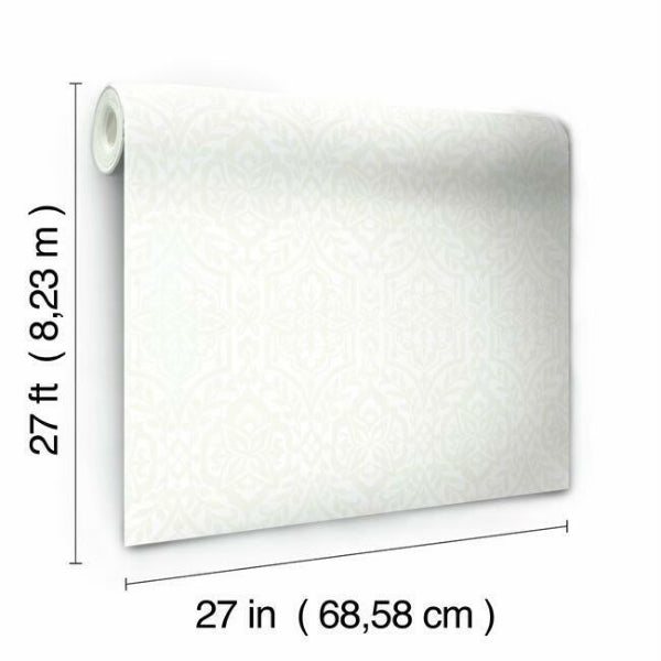Ornate, raised filigree pattern Cathedral Damask is inspired by the beauty of stained-glass windows. This Cathedral Damask Wallpaper measures approximately 27 inches wide by 27 feet long, measuring approximately 60.