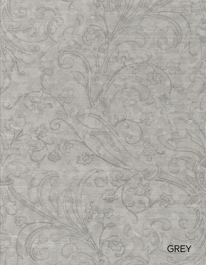A large scale but casual Damask in neutral and monotone colors creates a subtle but animated backdrop for any wall. A tried and true pattern that will never go out of fashion. Applied to a reflective grasscloth ground called Sisal. The floral pattern was created from a hand crafted design. Sold in standard lengths from 1 to 4 yards. Pattern is 35" wide after trim by installer