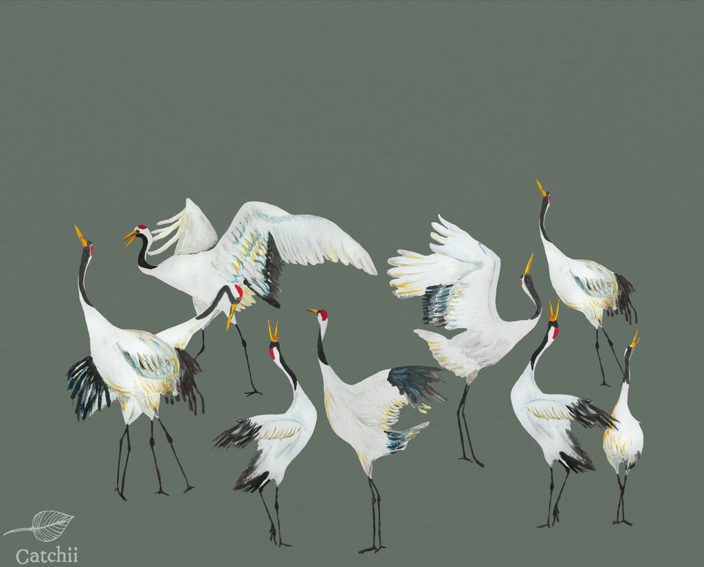 Mural Size 153" x 110" - 3 Smaller Sizes Available The crane dance is a ritual that the couple will perform together often throughout the year, to bond for life. The red-crowned cranes look and bow to each other. The pair jump into the air and raise their wings at the same time. In Japanese tradition, cranes symbolize longevity and happiness.