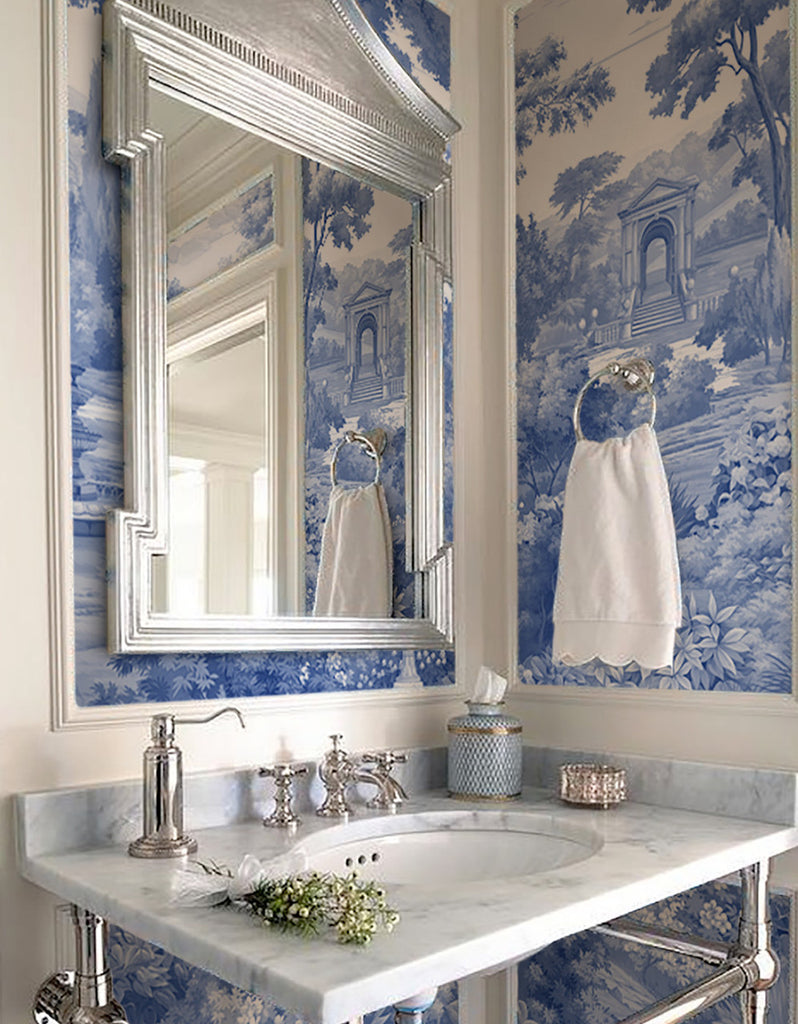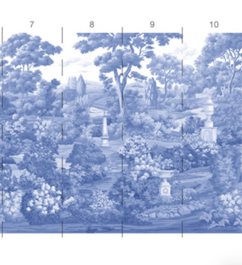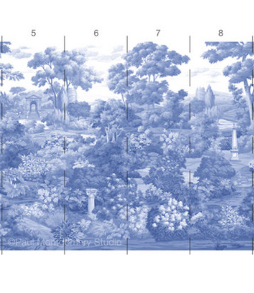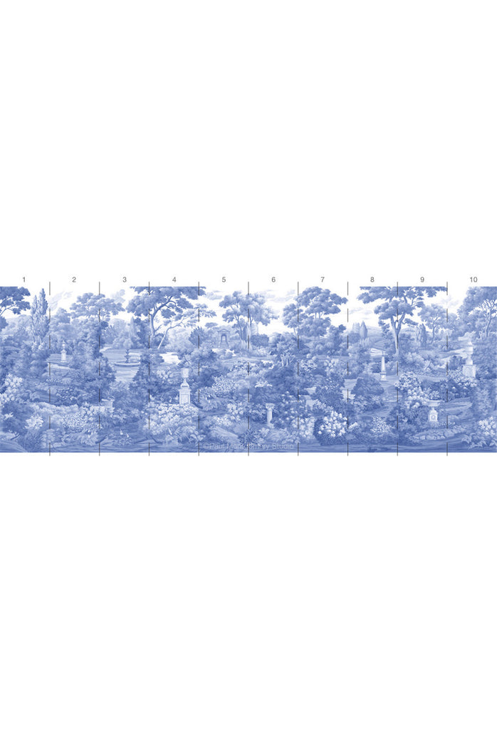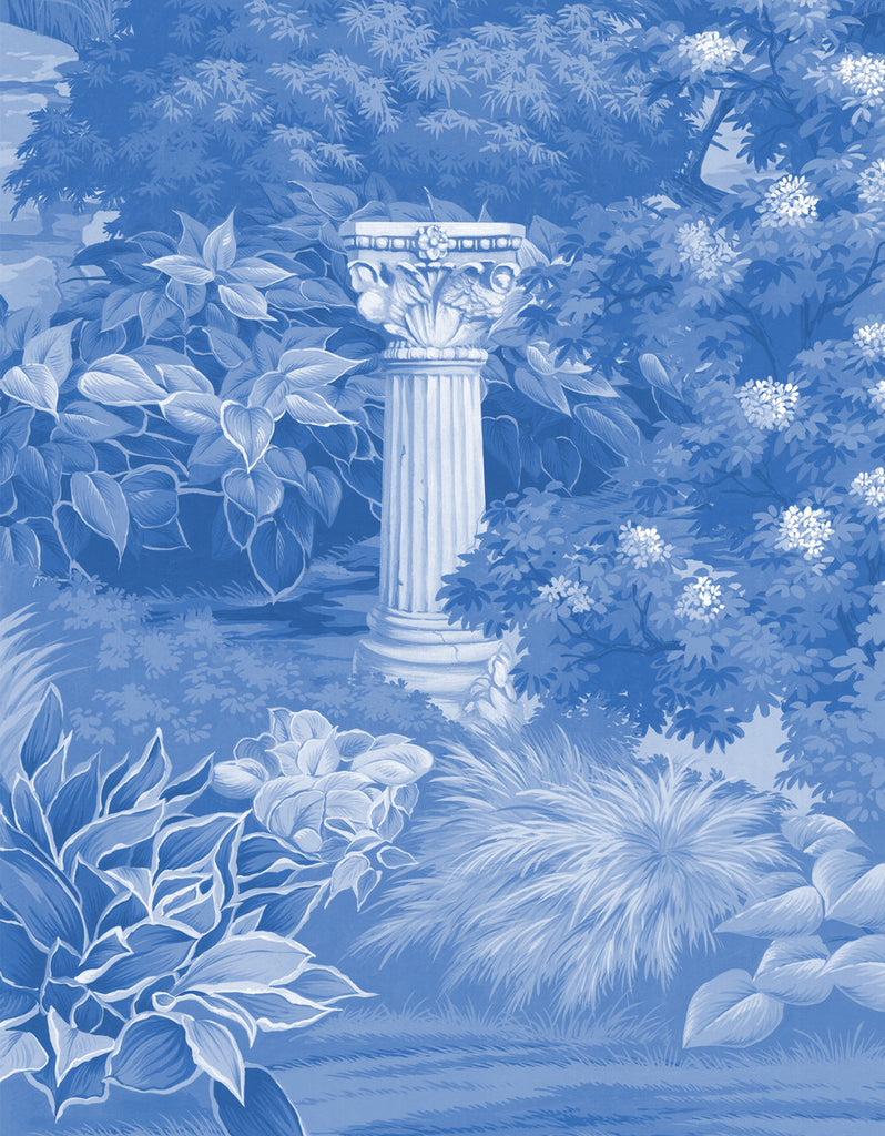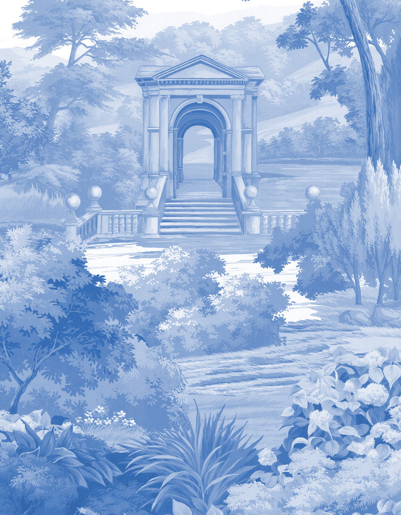 Blue Garden is an elegant depiction of classical English luxury gardens. 10 Panels Available in Full Length/Headers/Footers, Sold in individual Panels, Width: 36", Design Height: 120", Total Height: 120", Blue Garden,Paul Montgomery Studios