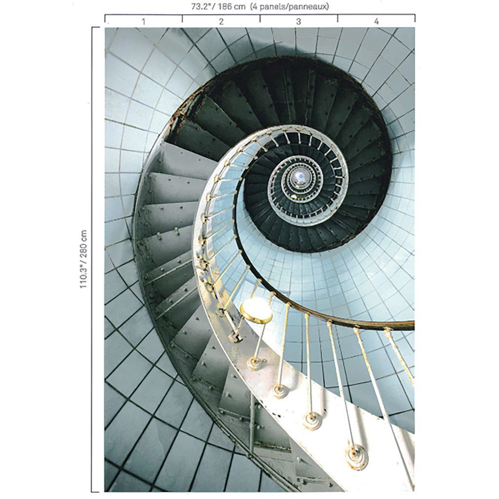 Introducing the Exclusive Wallcovering in Black, Blue, Creme, Beige, Grey, and Silver ASTM E84. Elevate your interior design projects with this mesmerizing wallpaper mural that will transport you to a world of endless elegance. With its captivating illusion of a never-ending round staircase, this piece is sure to leave a lasting impression on any space it graces. The harmonious blend of teal, grey, and white hues adds a touch of sophistication, making it a perfect choice for interior designers and architects seeking to create a truly remarkable ambiance.