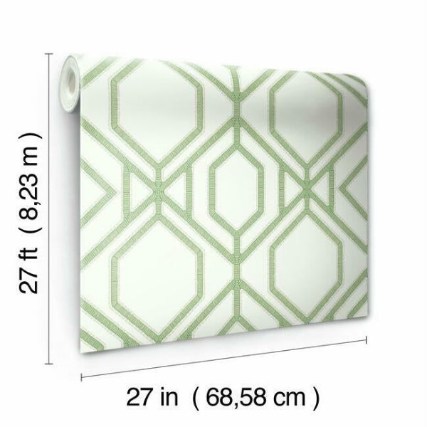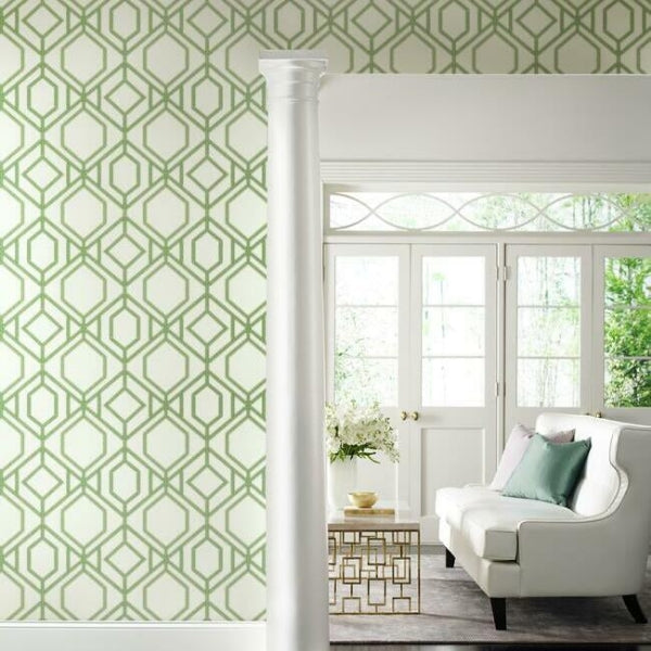 A nature-inspired diamond and hexagon geometric creates the Boho leaning of pattern Sawgrass Trellis. This Sawgrass Trellis Wallpaper measures approximately 27 inches wide by 27 feet long, covering About 60.