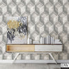 Cool greys combine to form a unique honeycomb pattern. This wood wallpaper is unlike the rest. The geometric design has a modern feel and the monochrome color palette softens the look. Shimmering champagne accents peek out from behind the distressing.