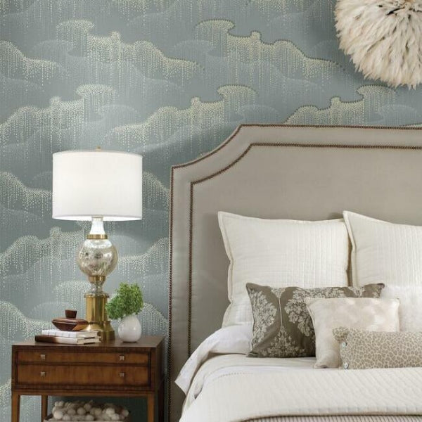 A cosmic, metallic ribbon creates a waterfall of shimmering stars in pattern Moonlight Pearls. This Moonlight Pearls Wallpaper measures approximately 27 inches wide by 27 feet long, covering About 60.