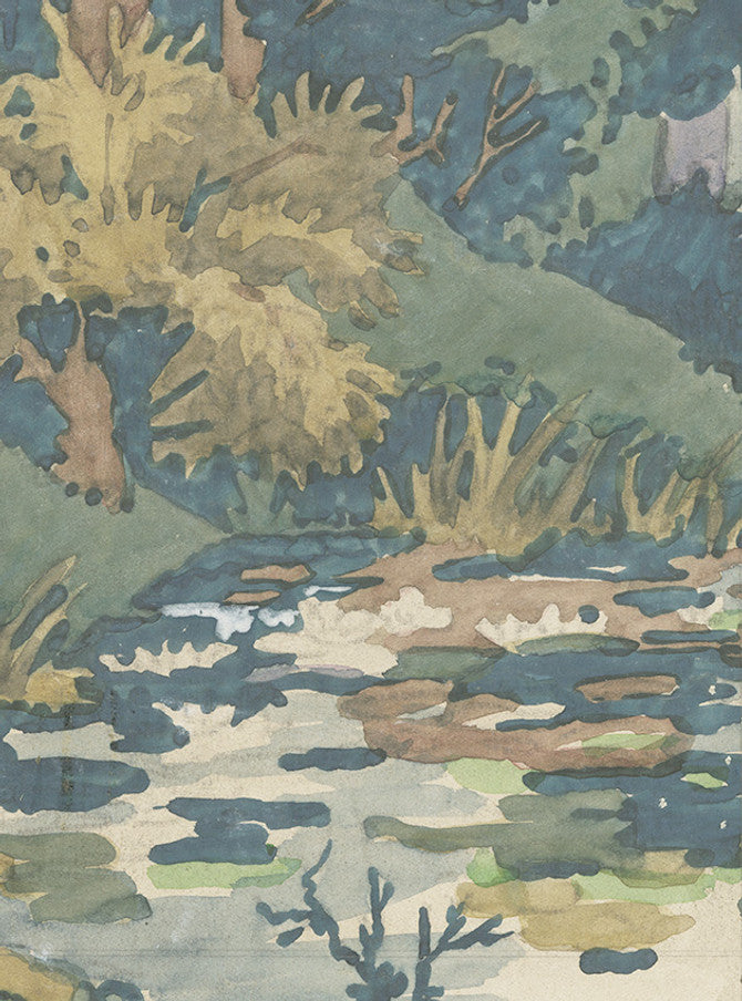 Ripley Wood is a new repeat pattern created from a watercolor landscape. This pattern was created from a hand painted repeat pattern design. This design is sold by the panel