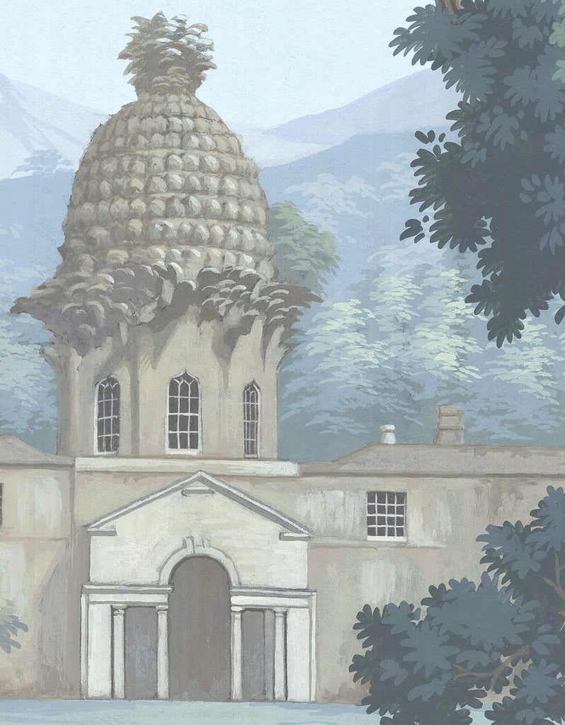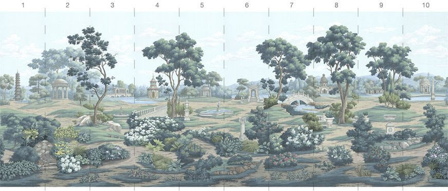 The English Parks mural wallpaper, designed by Paul Montgomery Studio, is an elegant depiction of classical English luxury gardens, filled with greenery, monuments, fountains, temples, and statues. Bridges, gazebos, and peaceful walkways are nestled among lush trees and flowers, creating a scenic and timeless atmosphere. This refined mural offers a sophisticated touch to any space, blending natural beauty with classical artistry.
