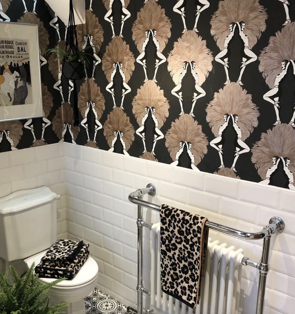 Bold silhouettes of showgirls in metallic bronze contrast against deep black in this striking design by Graduate Collection UK. #luxuryinteriors #glamorouswalls #statementwallcovering