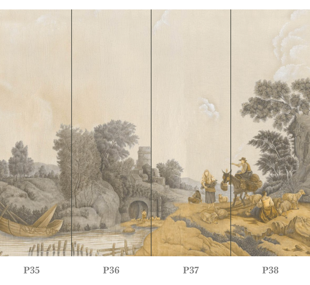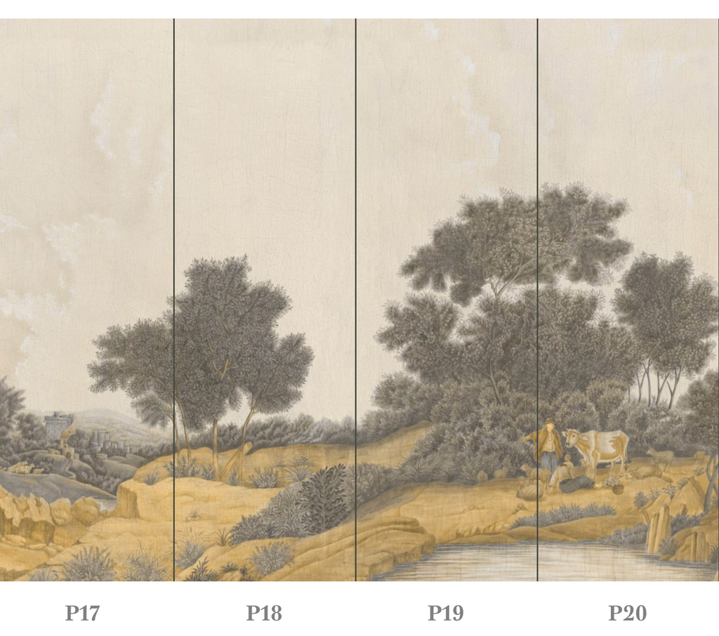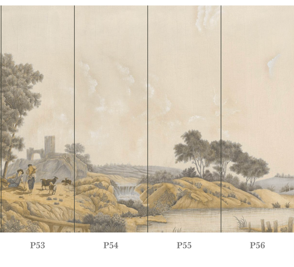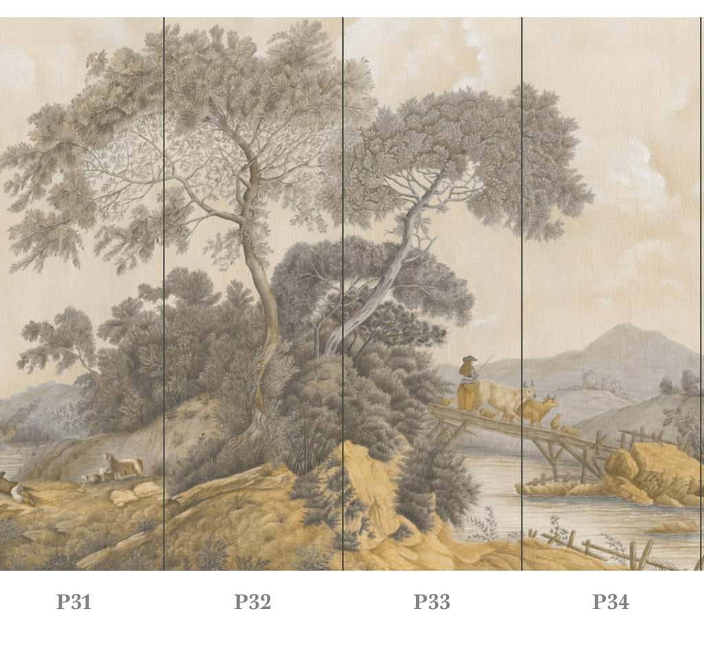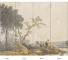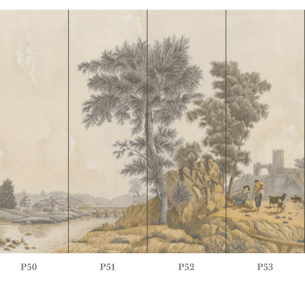 This landscape was developed from the less known aspect of Pillement. The famous French artist is mainly known for his decorative work in the Louis XV period when he collaborated with Boucher. As a young man, in 1750, he was invited to the Court of the King of Portugal where he painted fine landscapes. As these were composed in a systematic way and have a great unity of inspiration, Dimonah merged them into one large scenic decor which we had re-painted in our studio. Perfect subject matter for large rooms where you will have no repetition, given the enormous width of the decor. It is sold by panels of 90 cm width and in 5 standard heights : 225cm, 255cm, 275cm, 300cm, 325cm It is available in 3 standard color options : Multicolor, Sepia Tones and Grey Tones as well as in custom size & color. Assorted ceilings also available in custom. In standard height 325cm the full decor is 40,50 m long without repetition. As the majority of our decors, this decor loops. This means that last panel of each decor finishes where the first panel begins. As a consequence, you can start with any panel you want, and stop where you need. The design will continue as long as necessary Printed on PVC free 180 gr. Non-Woven paper; also available printed on Non-Woven Scrubbable paper & Vinyl Coated Scrubbable paper. Easy to install and remove : paste the wall only, strippable, dimensionally stable Made in London (UK) Non-Woven paper : Flame retardant and C-s1, d0 according to European Standard EN 13501-1 / ASTM – E84 Class A fire certification Vinyl Coated paper : Flame retardant and B-s1, d0 according to European Standard EN 13501-1 / ASTM – E84 Class A fire certification After receiving your sample, call us with your height requirements . Panels are sold in heights of 88 3/5", 100 3/8", 108 2/8", 118 1/8", 128" tall on paper or vinyl