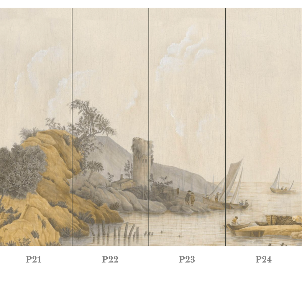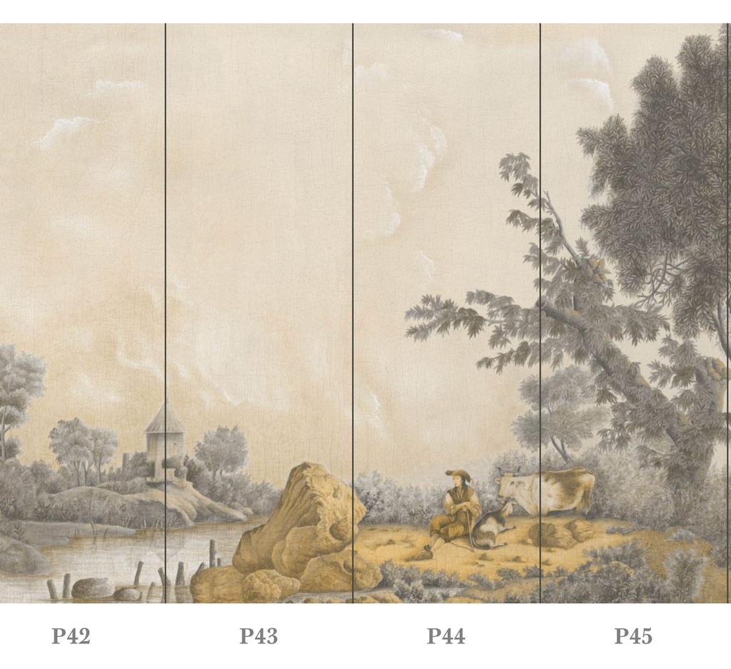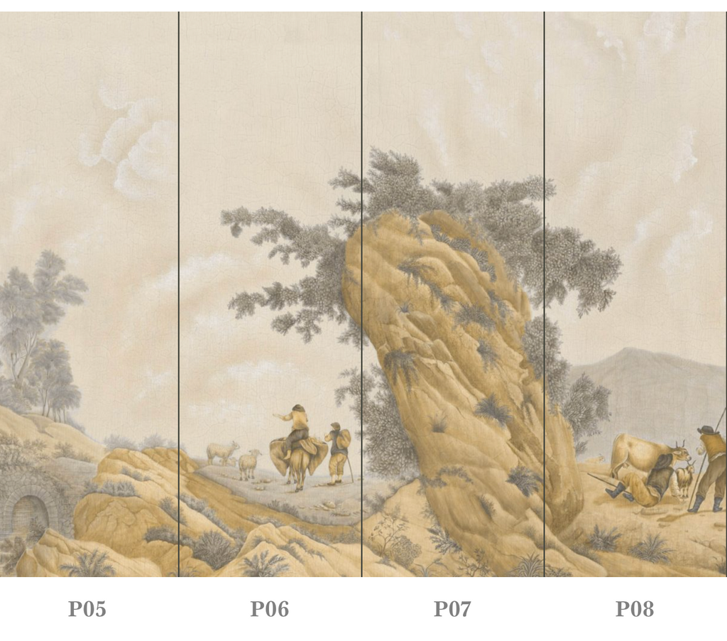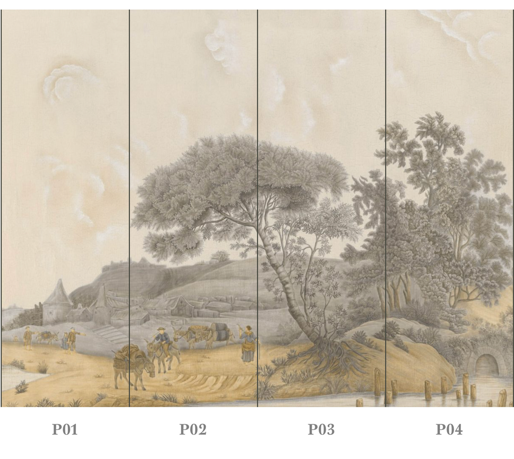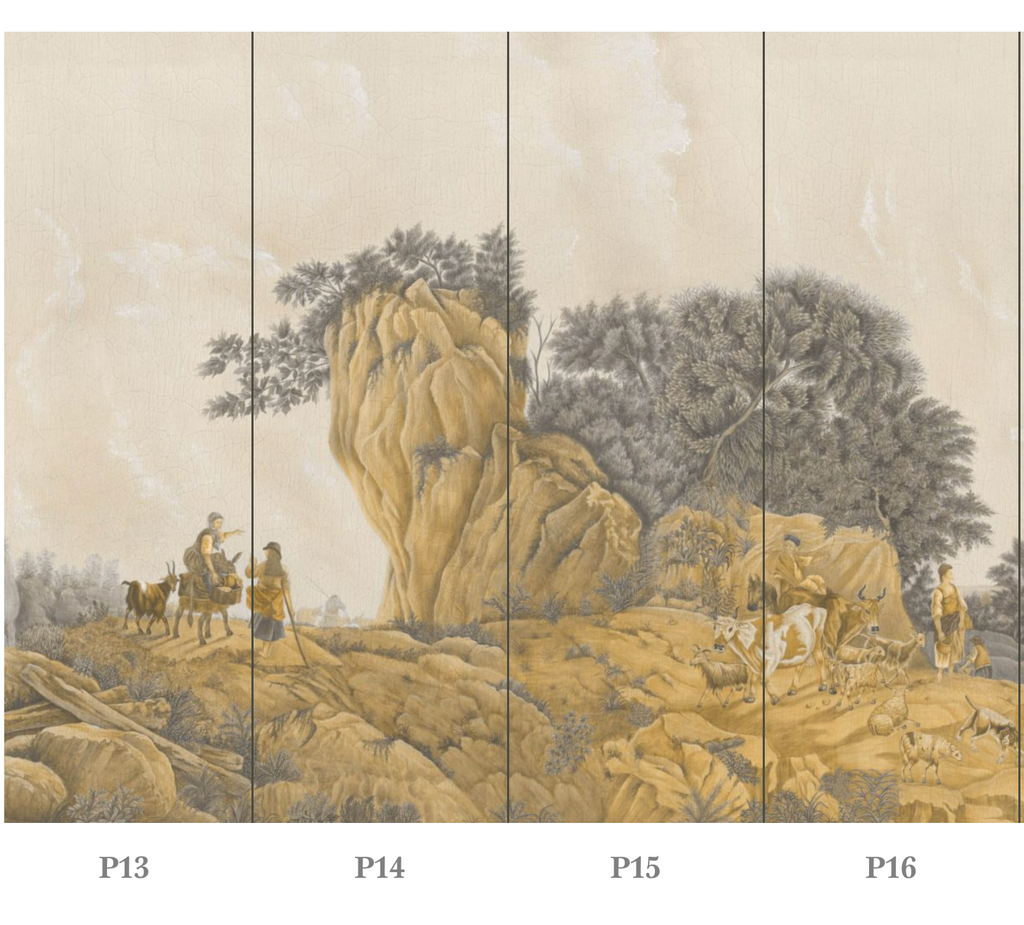This landscape was developed from the less known aspect of Pillement. The famous French artist is mainly known for his decorative work in the Louis XV period when he collaborated with Boucher. As a young man, in 1750, he was invited to the Court of the King of Portugal where he painted fine landscapes. As these were composed in a systematic way and have a great unity of inspiration, Dimonah merged them into one large scenic decor which we had re-painted in our studio. Perfect subject matter for large rooms where you will have no repetition, given the enormous width of the decor. It is sold by panels of 90 cm width and in 5 standard heights : 225cm, 255cm, 275cm, 300cm, 325cm It is available in 3 standard color options : Multicolor, Sepia Tones and Grey Tones as well as in custom size & color. Assorted ceilings also available in custom. In standard height 325cm the full decor is 40,50 m long without repetition. As the majority of our decors, this decor loops. This means that last panel of each decor finishes where the first panel begins. As a consequence, you can start with any panel you want, and stop where you need. The design will continue as long as necessary Printed on PVC free 180 gr. Non-Woven paper; also available printed on Non-Woven Scrubbable paper & Vinyl Coated Scrubbable paper. Easy to install and remove : paste the wall only, strippable, dimensionally stable Made in London (UK) Non-Woven paper : Flame retardant and C-s1, d0 according to European Standard EN 13501-1 / ASTM – E84 Class A fire certification Vinyl Coated paper : Flame retardant and B-s1, d0 according to European Standard EN 13501-1 / ASTM – E84 Class A fire certification After receiving your sample, call us with your height requirements . Panels are sold in heights of 88 3/5", 100 3/8", 108 2/8", 118 1/8", 128" tall on paper or vinyl