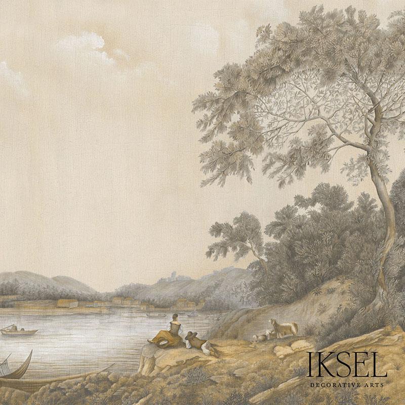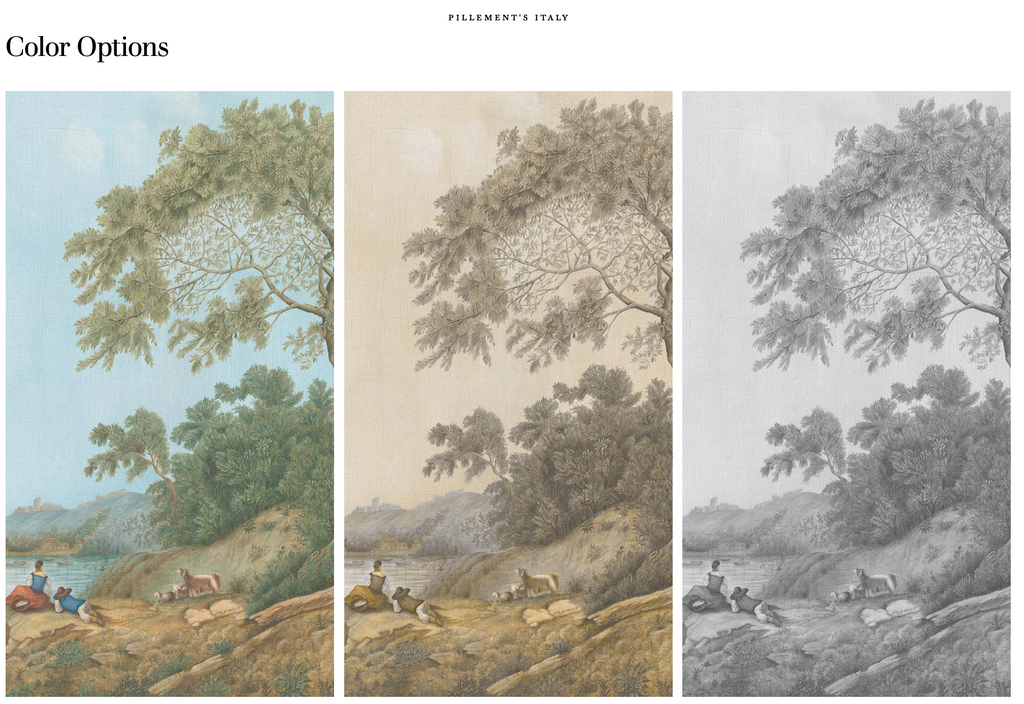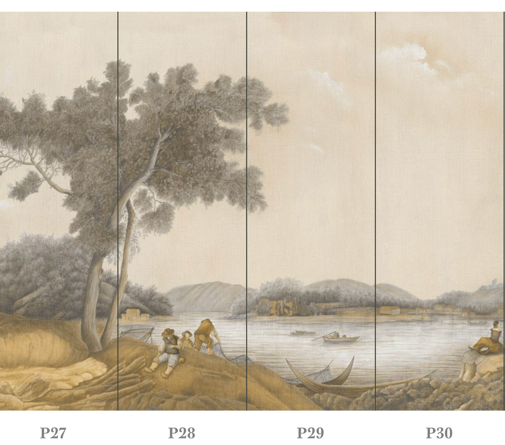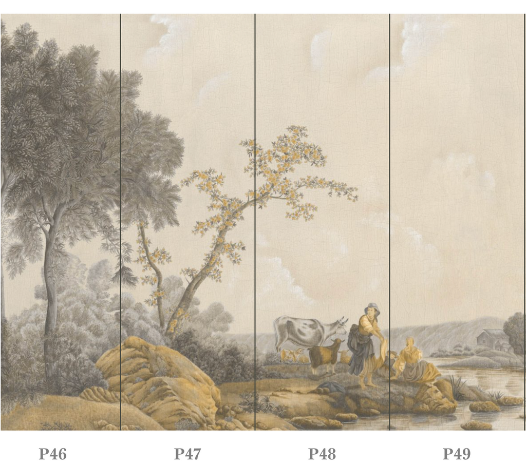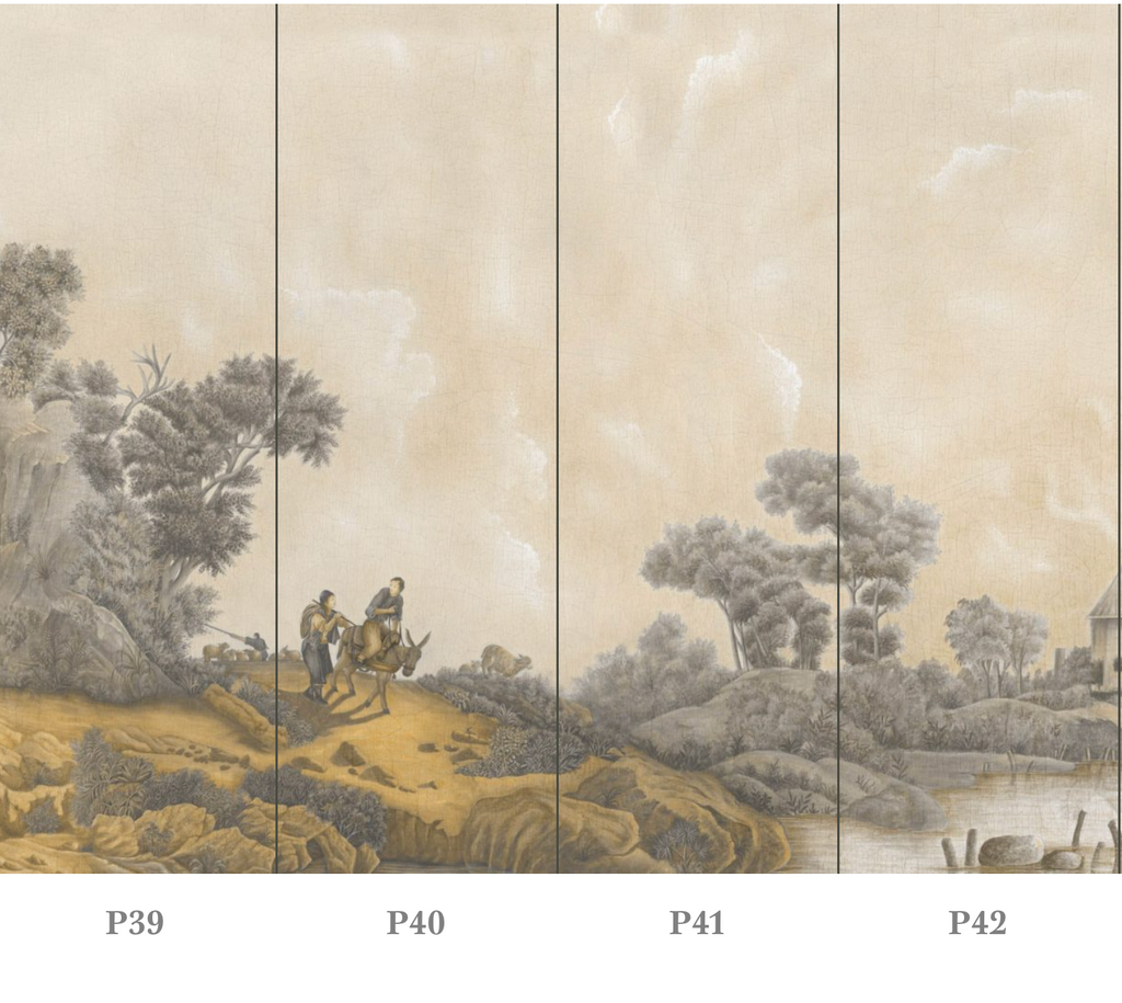 This landscape was developed from the less known aspect of Pillement. The famous French artist is mainly known for his decorative work in the Louis XV period when he collaborated with Boucher. As a young man, in 1750, he was invited to the Court of the King of Portugal where he painted fine landscapes. As these were composed in a systematic way and have a great unity of inspiration, Dimonah merged them into one large scenic decor which we had re-painted in our studio. Perfect subject matter for large rooms where you will have no repetition, given the enormous width of the decor. It is sold by panels of 90 cm width and in 5 standard heights : 225cm, 255cm, 275cm, 300cm, 325cm It is available in 3 standard color options : Multicolor, Sepia Tones and Grey Tones as well as in custom size & color. Assorted ceilings also available in custom. In standard height 325cm the full decor is 40,50 m long without repetition. As the majority of our decors, this decor loops. This means that last panel of each decor finishes where the first panel begins. As a consequence, you can start with any panel you want, and stop where you need. The design will continue as long as necessary Printed on PVC free 180 gr. Non-Woven paper; also available printed on Non-Woven Scrubbable paper & Vinyl Coated Scrubbable paper. Easy to install and remove : paste the wall only, strippable, dimensionally stable Made in London (UK) Non-Woven paper : Flame retardant and C-s1, d0 according to European Standard EN 13501-1 / ASTM – E84 Class A fire certification Vinyl Coated paper : Flame retardant and B-s1, d0 according to European Standard EN 13501-1 / ASTM – E84 Class A fire certification After receiving your sample, call us with your height requirements . Panels are sold in heights of 88 3/5", 100 3/8", 108 2/8", 118 1/8", 128" tall on paper or vinyl