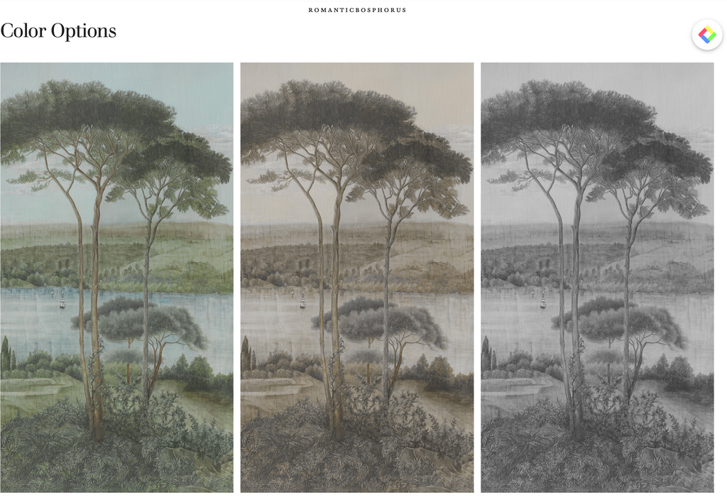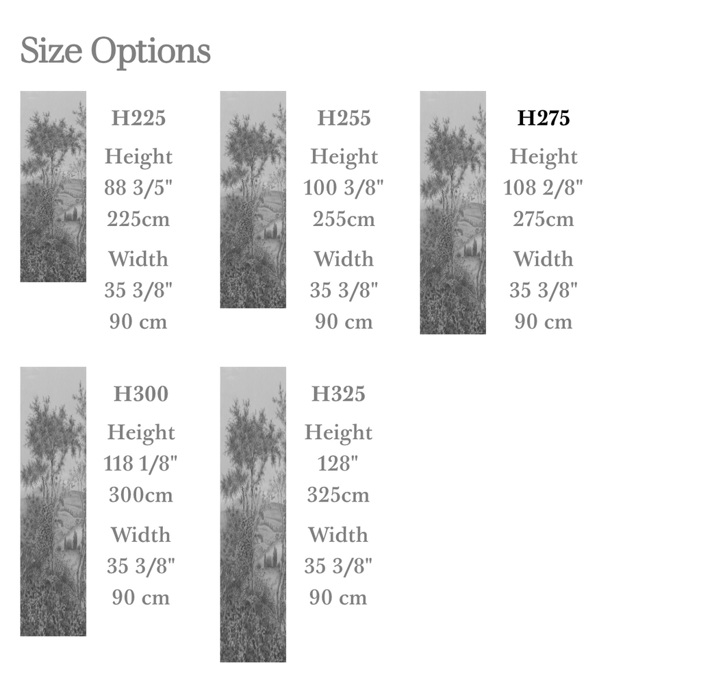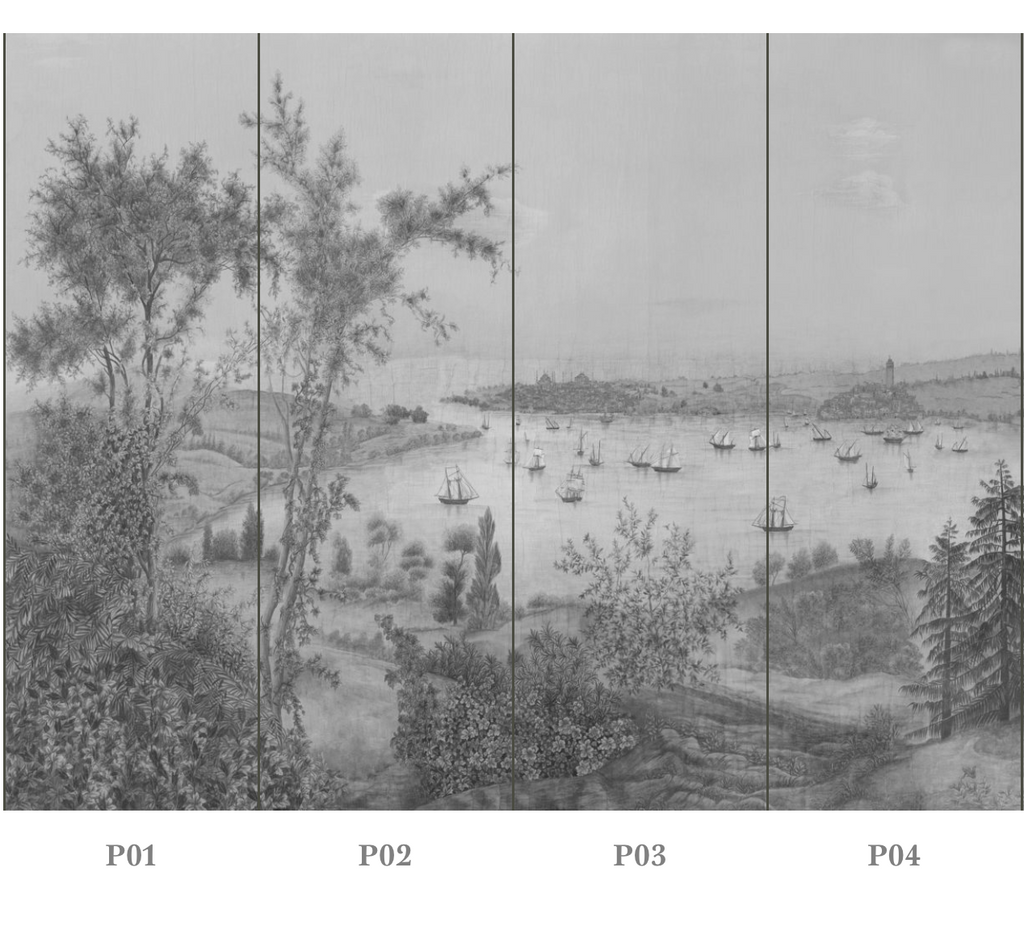 This decor was painted in our studio after a lithograph printed in the 1850s by the Maltese painter Jean-Giovanni Schranz. We decided to make a full ���verdure��� out of it, omitting characters and simplified buildings. The result is a much greener and sparser Bosphorus than that of the time. However, the stunning nature and topography are very much present. It is sold by panels of 90 cm width and in 5 standard heights : 225cm, 255cm, 275cm, 300cm, 325cm ��� It is available in 3 standard color options : Multicolor, Sepia Tones and Grey Tones as well as in custom size & color. Assorted ceilings also available in custom.��� In standard height 325cm the full decor is 15,30 m long without repetition. As the majority of our decors, this decor loops. This means that last panel of each decor finishes where the first panel begins. As a consequence, you can start with any panel you want, and stop where you need. The design will continue as long as necessary��� Printed on PVC free 180 gr. Non-Woven paper; also available printed on Non-Woven Scrubbable paper & Vinyl Coated Scrubbable paper.��� Easy to install and remove : paste the wall only, strippable, dimensionally stable��� Made in London (UK)��� Non-Woven paper : Flame retardant and C-s1, d0 according to European Standard EN 13501-1 / ASTM ��� E84 Class A ���re certi���cation��� Vinyl Coated paper : Flame retardant and B-s1, d0 according to European Standard EN 13501-1 / ASTM ��� E84 Class A ���re certi���cation After receiving your sample, call us with your height requirements . Panels are sold in heights of 88 3/5", 100 3/8", 108 2/8", 118 1/8", 128" tall on paper or vinyl