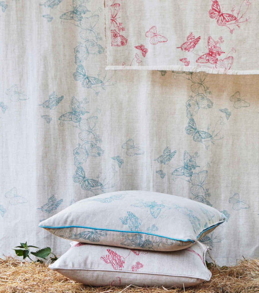 A kaleidoscope of butterflies, printed on a natural un-dyed linen cotton