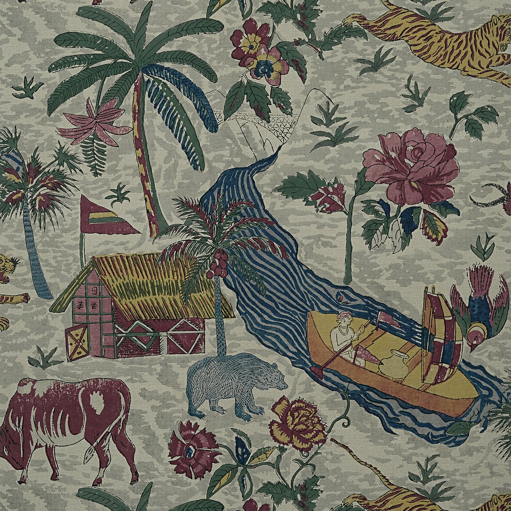 Colony is a curated collection of wallcoverings and fabrics influenced by centuries-old techniques of African craft and textiles that traveled the trade routes. Graphic mudcloth and chevron designs, loosely painted florals and a scenic tiger reserve landscape come together with a coordinating tailored plaid, bold giraffe print, and primitive shapes. This abundant collection is filled with colors ranging from natural earthy tones and greys to vibrant crimson reds, deep blues, verdant greens and saffron that were inspired by artisanal natural dyes.