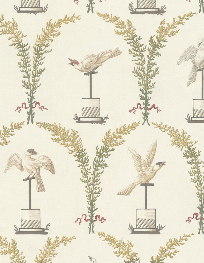 Imaginative neoclassical meets whimsy in these bird topped columns embellished with rosemary garland. A beautiful patterned wallpaper in our Cabinet of Curiosities by Paul Montgomery collection.