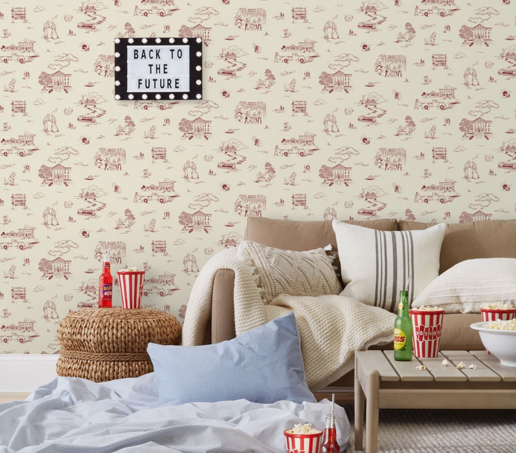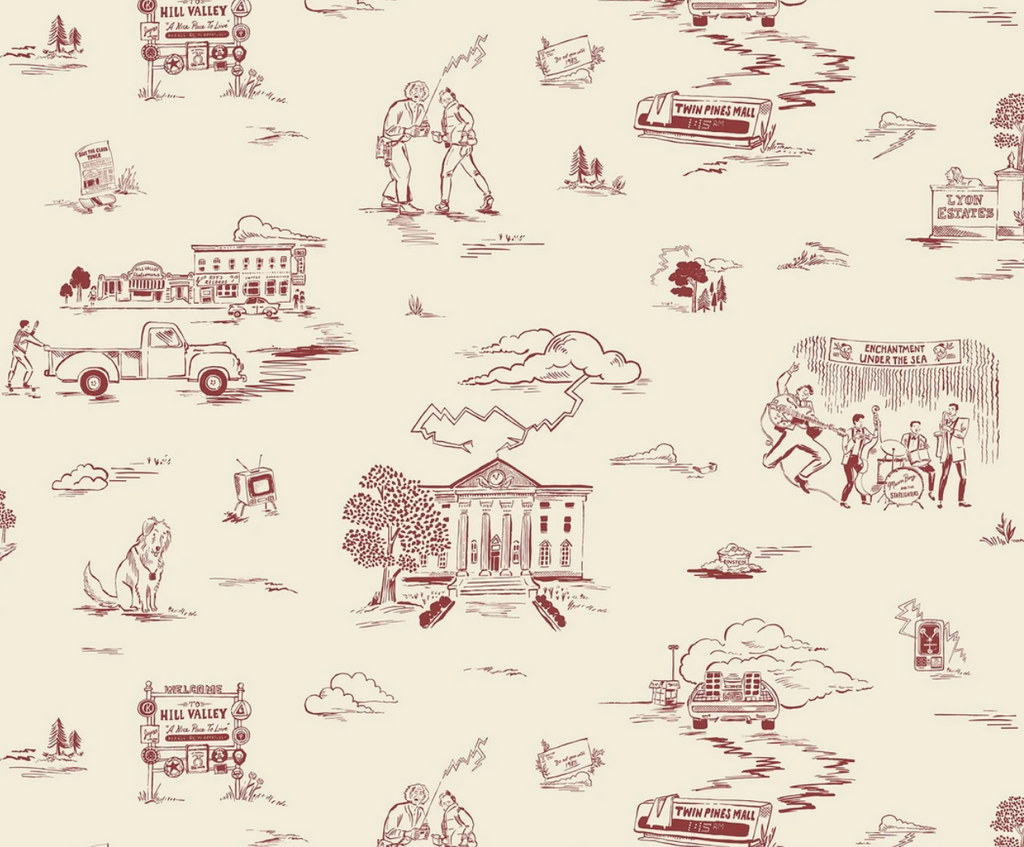 Meet us at the Twin Pines mall parking lot and hop a ride on a tricked out DeLorean. Destination: Hill Valley, California, 1955. Traditional toile gets a pop culture makeover with a blast from the past in this design inspired by the beloved 1985 film Back to the Future. Designed by Annie Brady. © Universal City Studios LLC and Amblin Entertainment, Inc. All Rights Reserved.