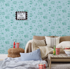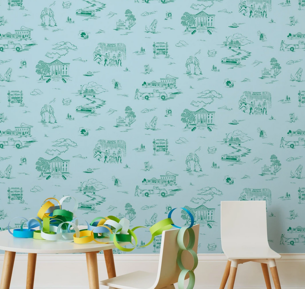 Whimsical scenes from Hill Valley unfold in soft sky blue tones, capturing retro charm with playful architectural detail. #moderninteriors #statementwall #walldecorstyle
