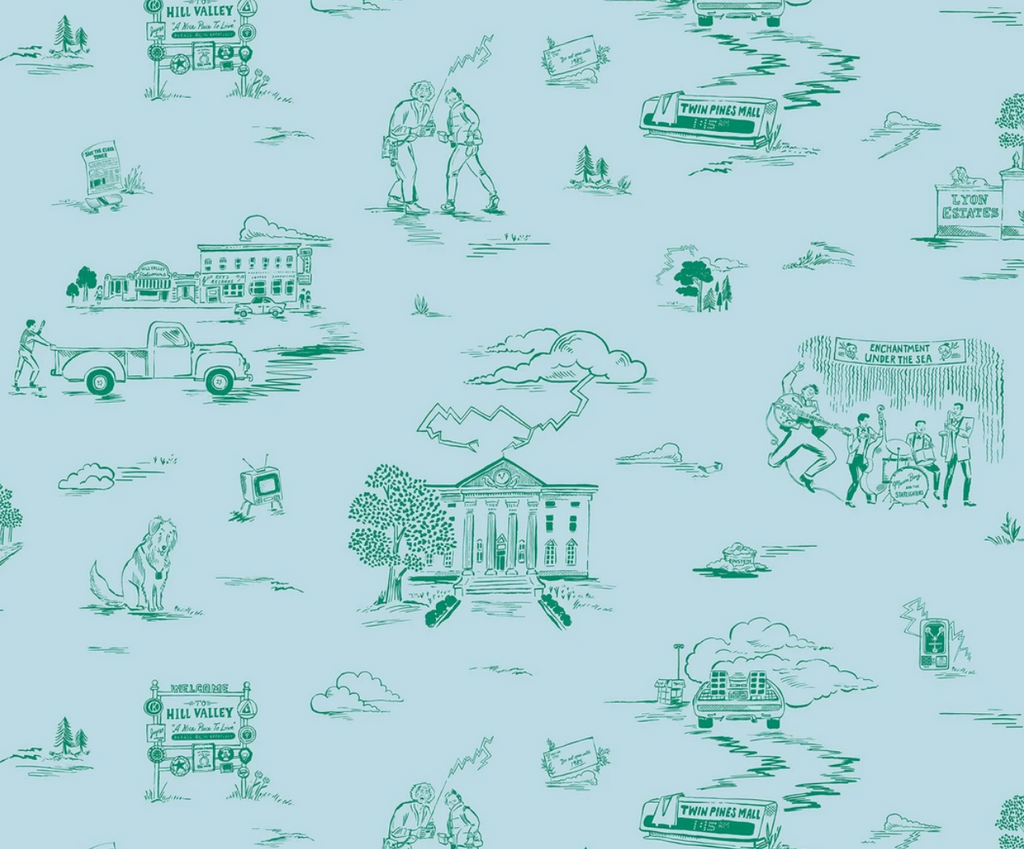Meet us at the Twin Pines mall parking lot and hop a ride on a tricked out DeLorean. Destination: Hill Valley, California, 1955. Traditional toile gets a pop culture makeover with a blast from the past in this design inspired by the beloved 1985 film Back to the Future. Designed by Annie Brady. © Universal City Studios LLC and Amblin Entertainment, Inc. All Rights Reserved.