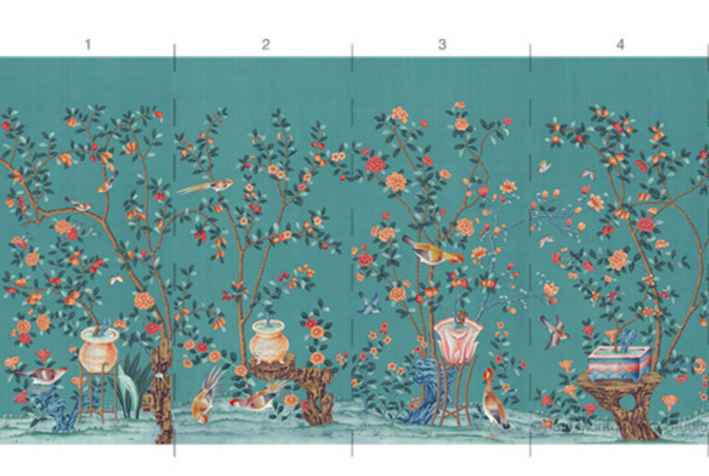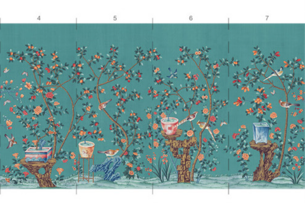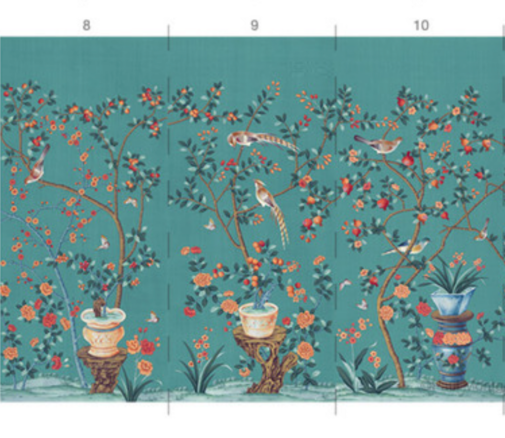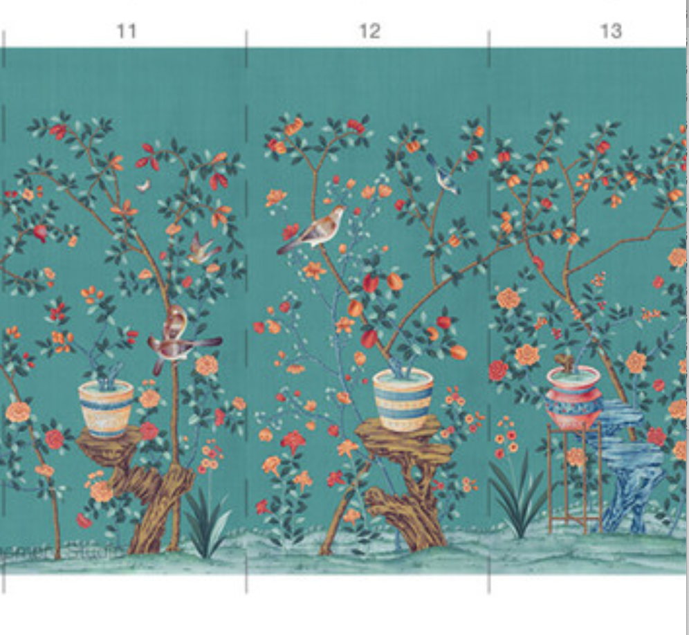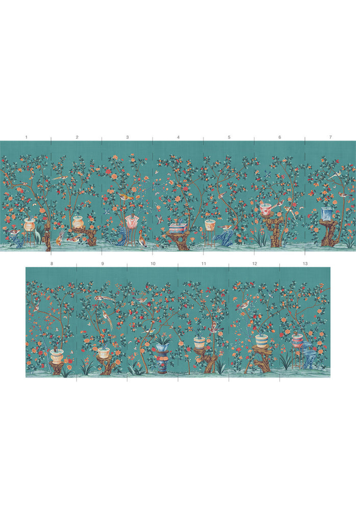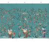 Bel Aire is a sophisticated Chinoiserie mural with bright contrast of deep blues and greens with bright yellows, magentas, reds, and more. This mural is available in 4 color themes. 13 Panels Available in Full Length/Headers/Footers, Sold in individual Panels, Width: 36", Design Height: 84", Total Height: 72", Bel Aire,Paul Montgomery Studios