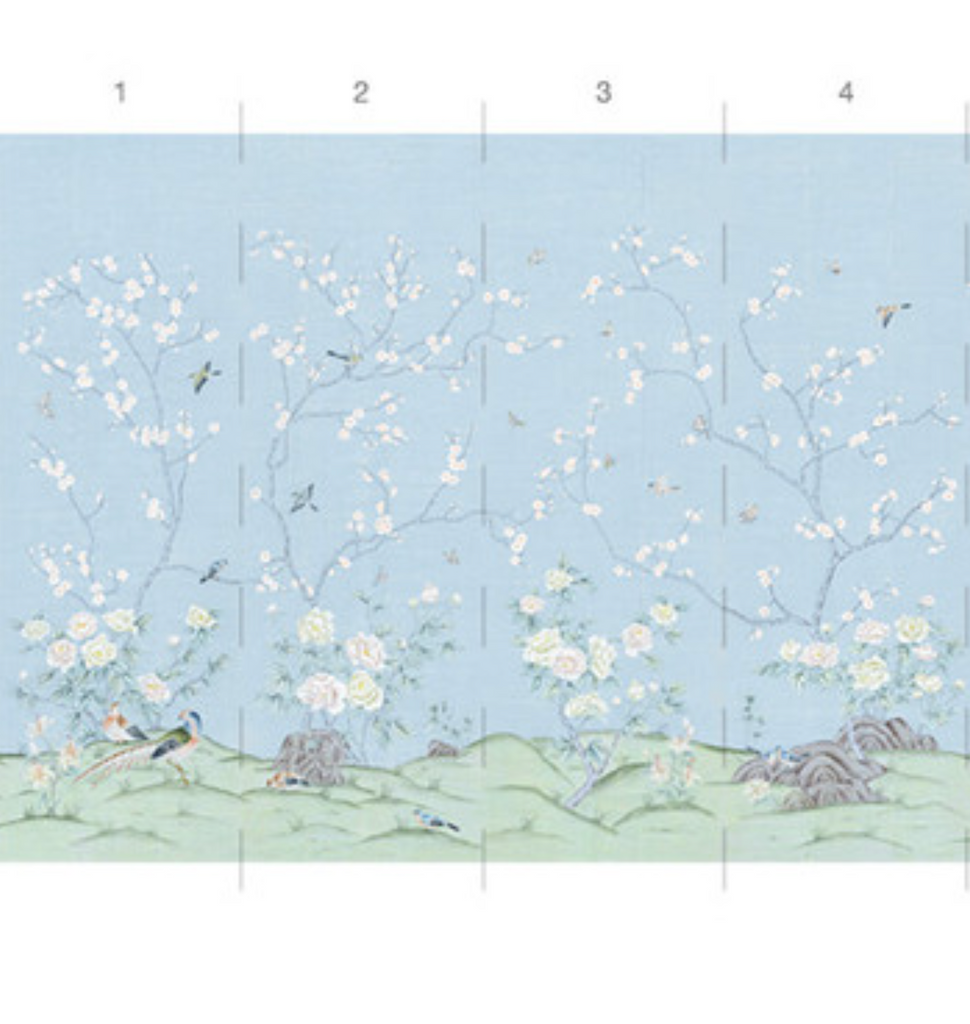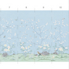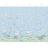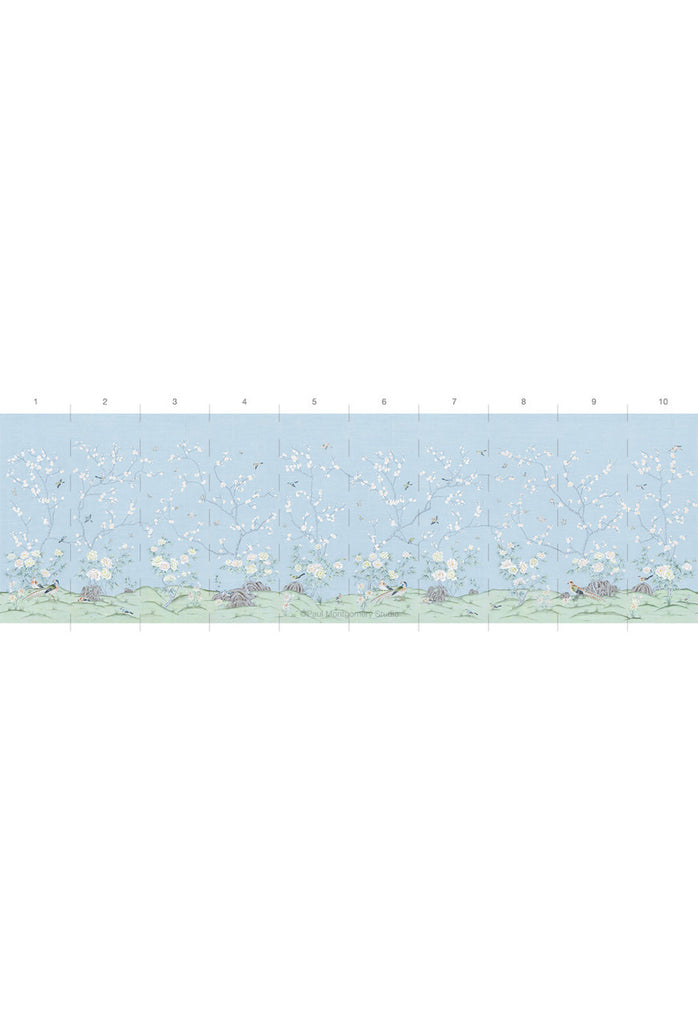 Belva is a chinoiserie mural depicting a beautiful landscape of trees, large pheasants and lovely peony flowers on a powder blue background in Tea Paper effect. 10 Panels Available in Full Length/Headers/Footers, Sold in individual Panels, Width: 36", Design Height: 108", Total Height: 93", Belva,Paul Montgomery Studios