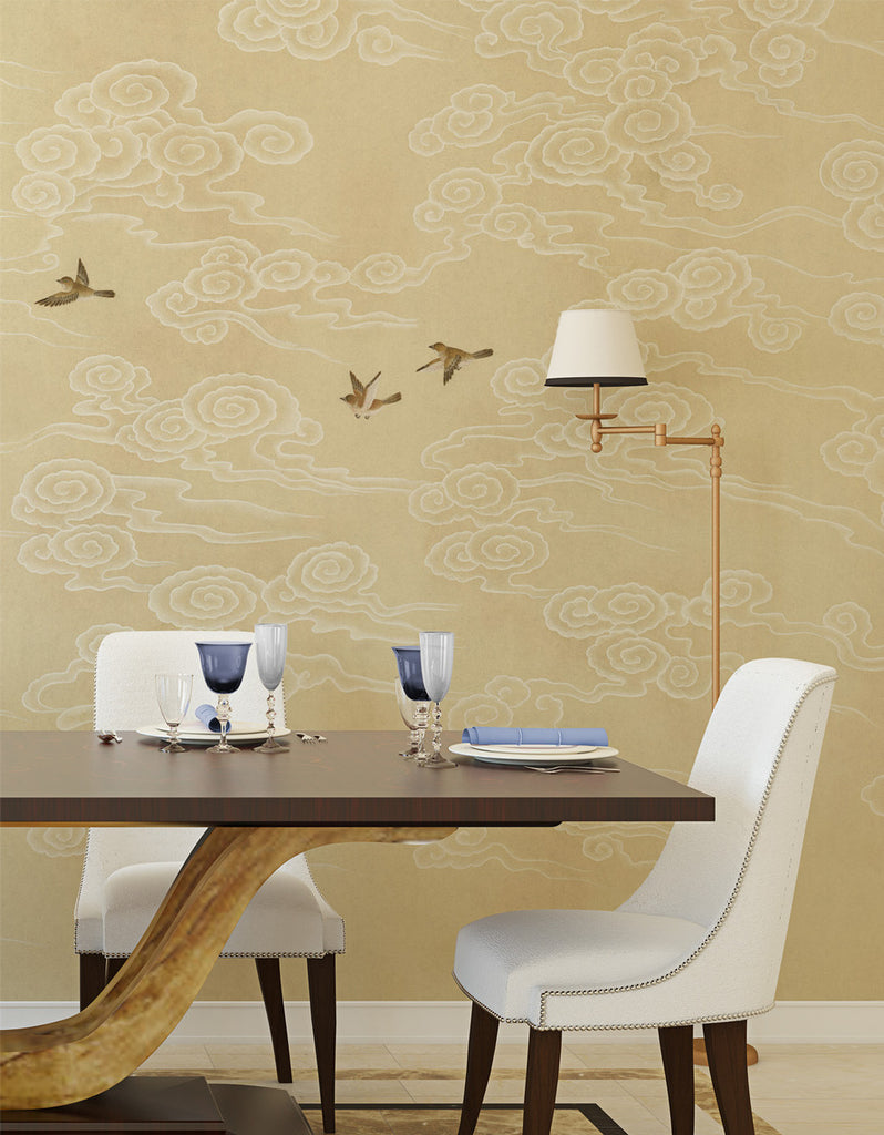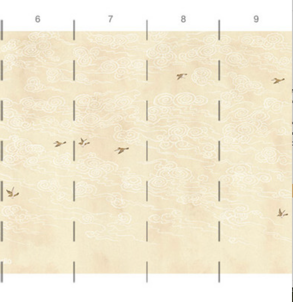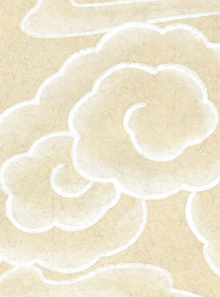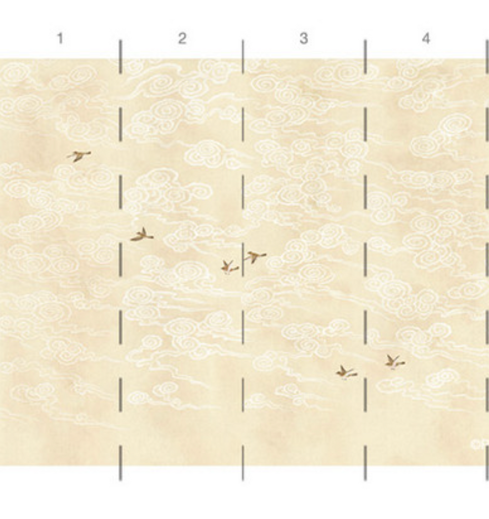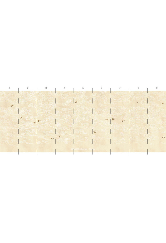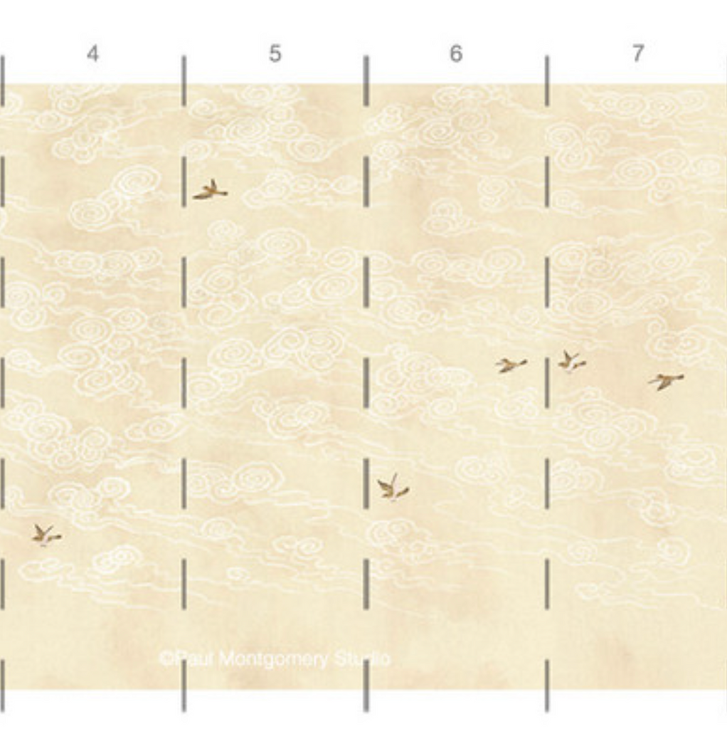 Celeste cream depicts fanciful clouds stylized in traditional Chinese whimsy with flying birds on a faded navy background. 9 Panels Available in Full Length/Headers/Footers, Sold in individual Panels, Width: 36", Design Height: 120", Total Height: 108", Celeste Cream,Paul Montgomery Studios