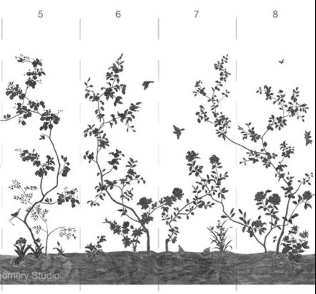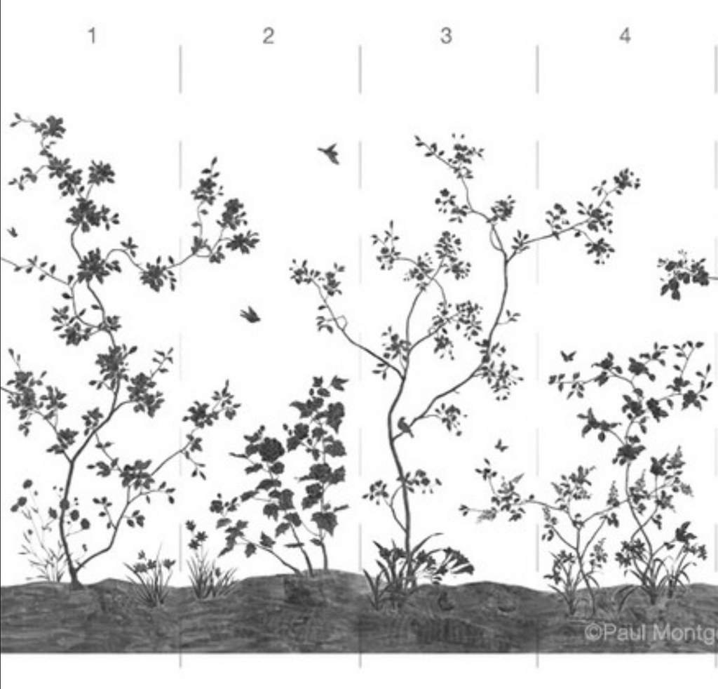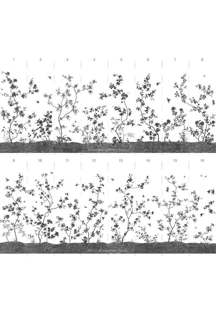 Chanteur White is a modern chinoiserie mural with monochromatic design on a white background. 16 Panels Available in Full Length/Headers/Footers, Sold in individual Panels, Width: 36", Design Height: 120", Total Height: 108", Chanteur White,Paul Montgomery Studios