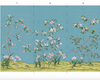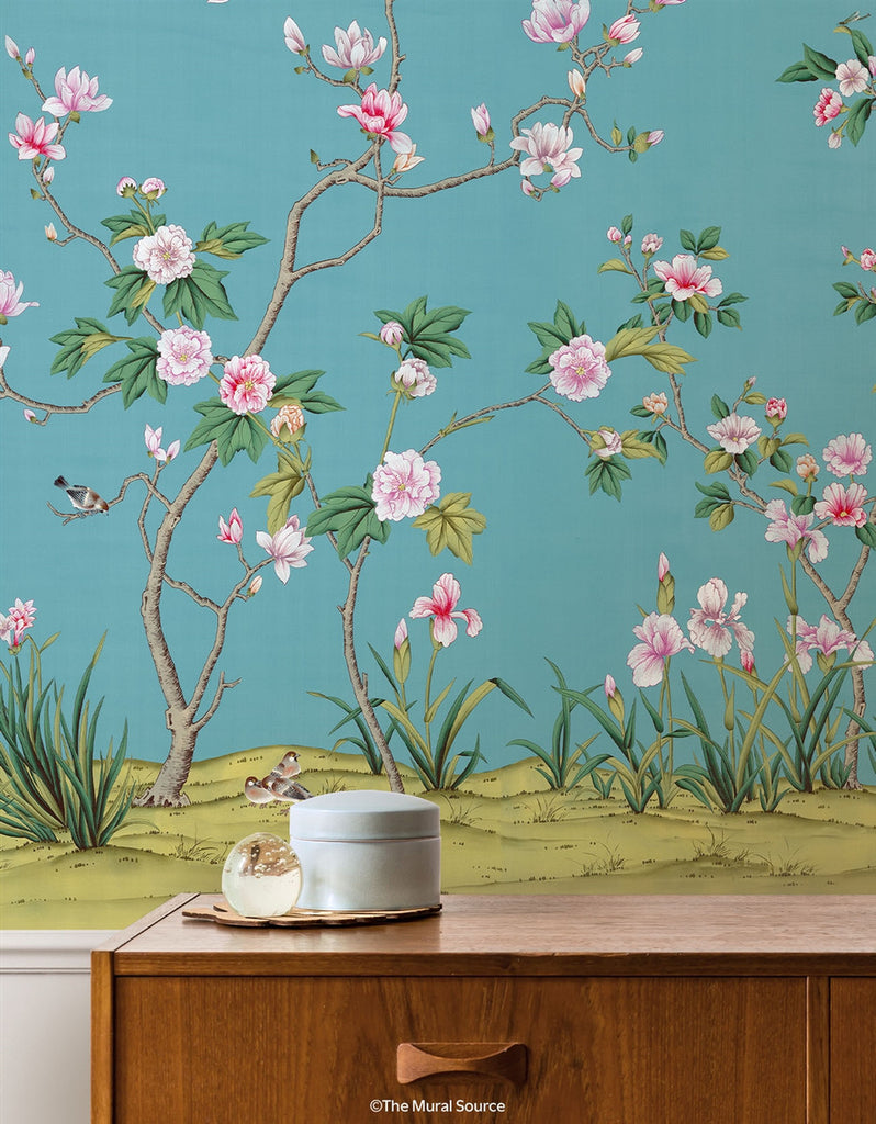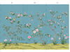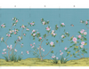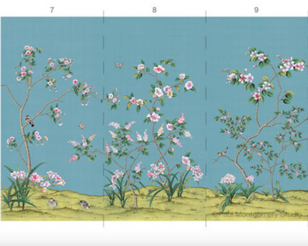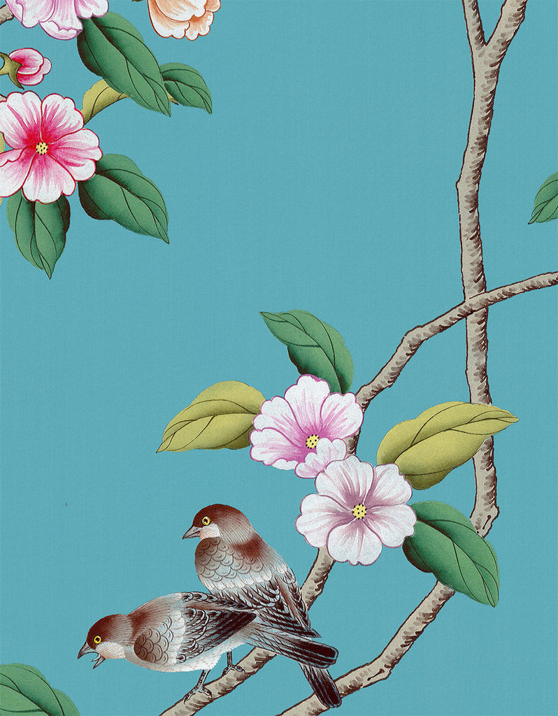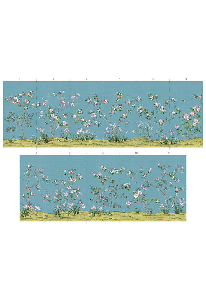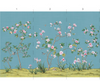 Cheridah is a chinoiserie mural that is rich in deep blues, greens, and reds on a smooth aqua background. 11 Panels Available in Full Length/Headers/Footers, Sold in individual Panels, Width: 36", Design Height: 72", Total Height: 62", Cheridah,Paul Montgomery Studios