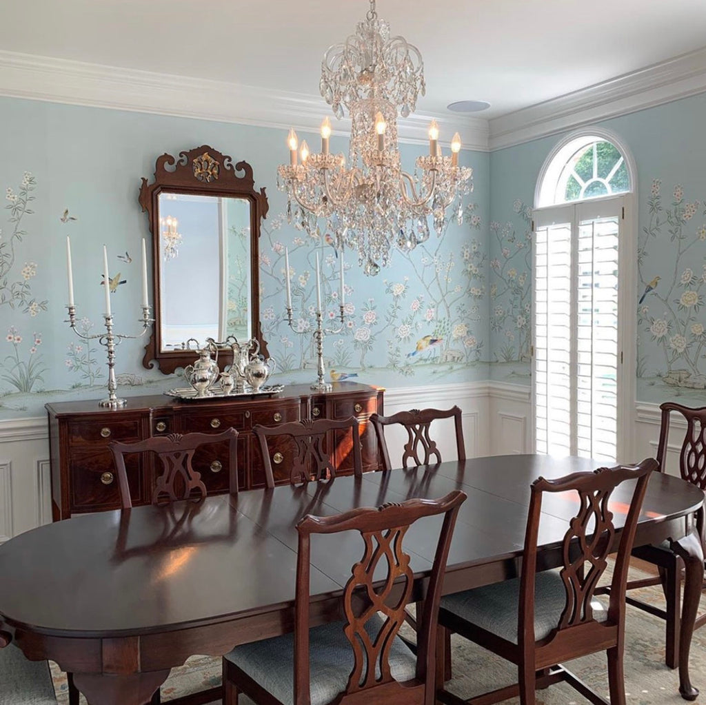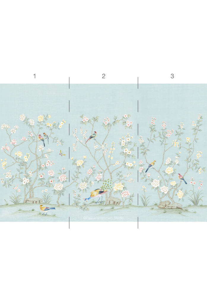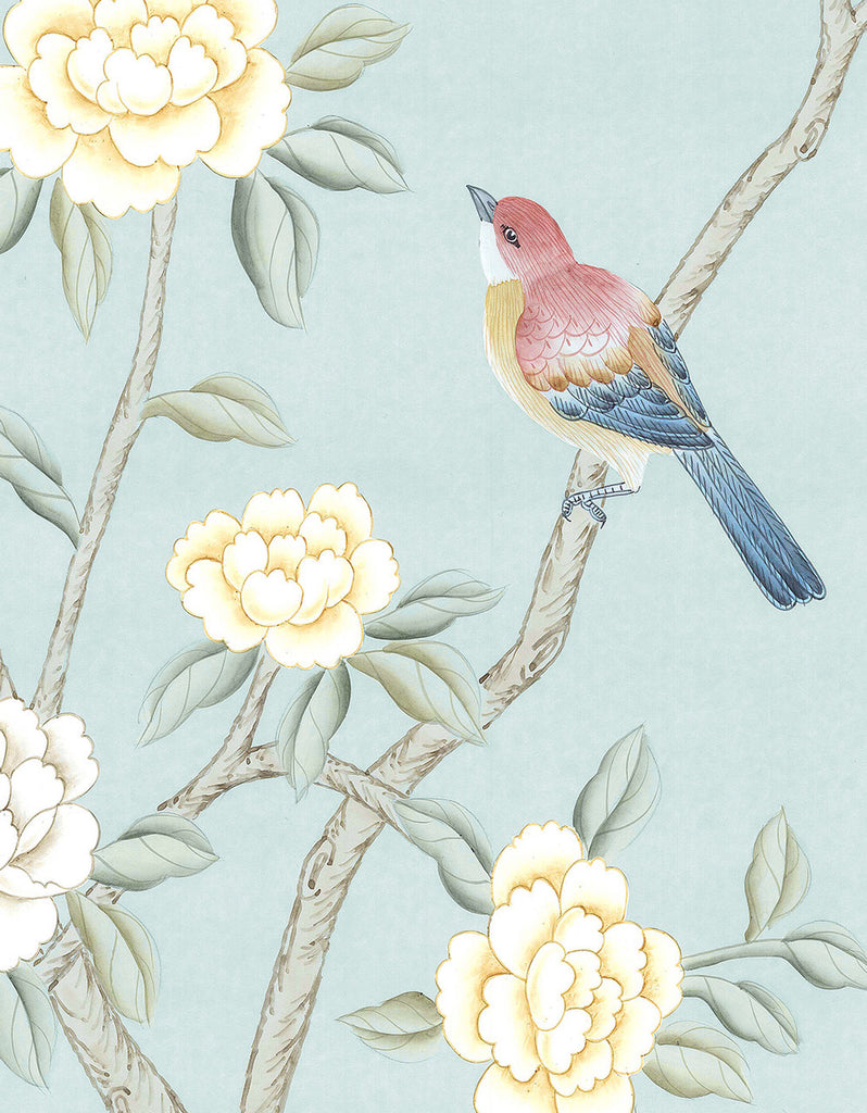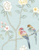 Collingwood is a Chinoiserie mural. This mural wallpaper features a powdery blue background and pastel spring-themed colors with peony flowers and fantastic birds. 3 Panels Available in Full Length/Headers/Footers, Sold in individual Panels, Width: 36", Design Height: 68" 72", Total Height: 56", Collingwood,Paul Montgomery Studios