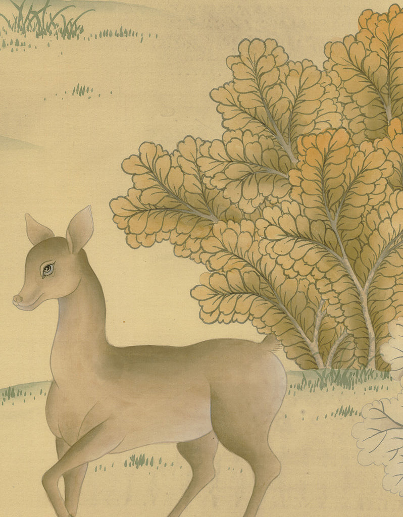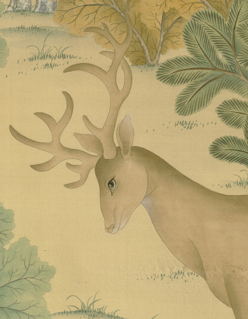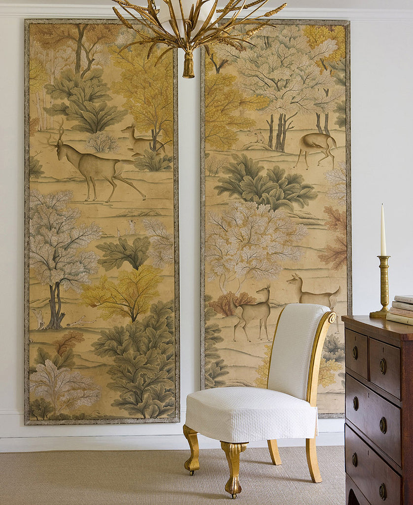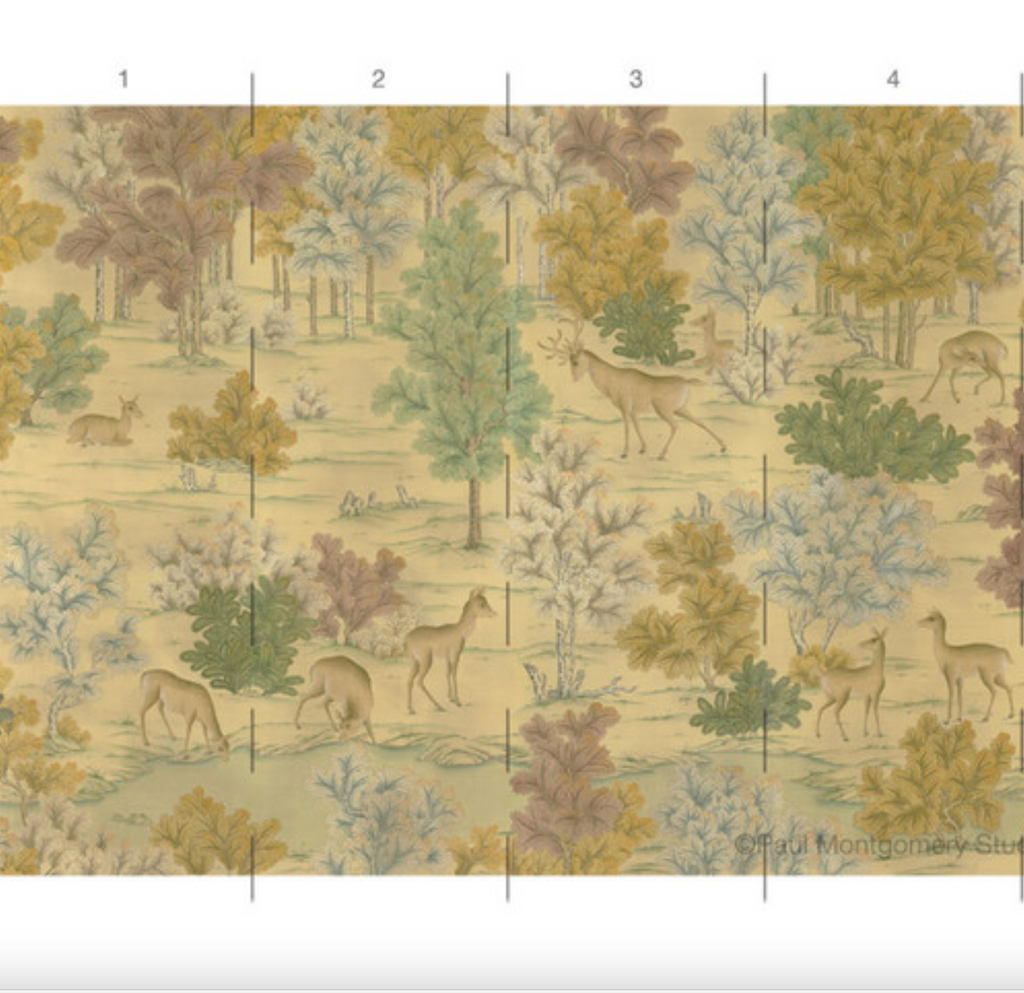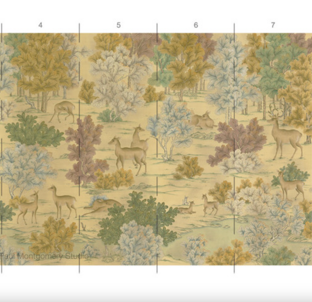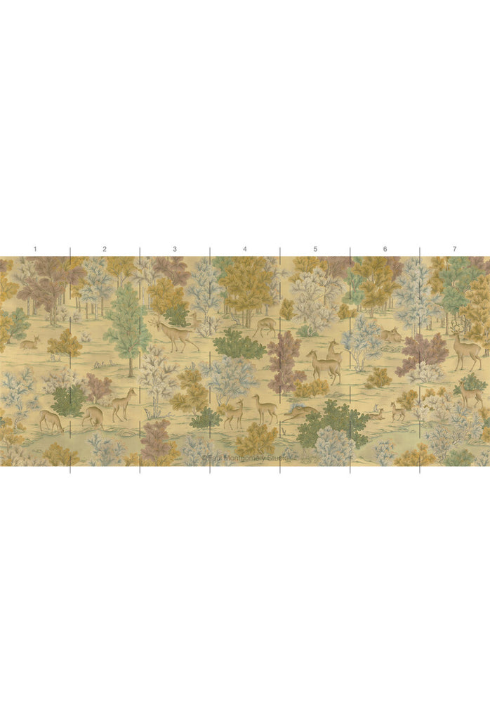 Combray Beige is a chinoiserie mural takes the viewer into a beautifully stylized forest with earth tones populated with wild deer. The original Chinese inspiration for this mural is centuries old. 10 Panels Available in Full Length/Headers/Footers, Sold in individual Panels, Width: 30" 36", Design Height: 120" 144", Total Height: 144", Combray Beige,Paul Montgomery Studios