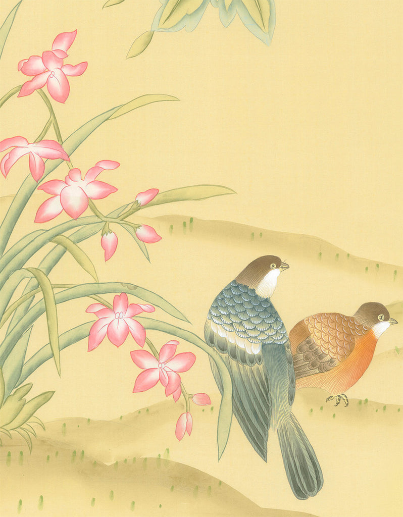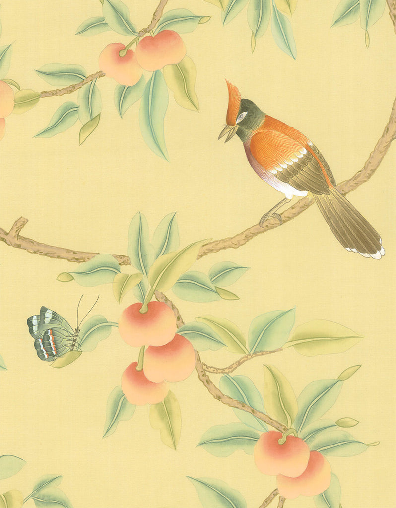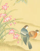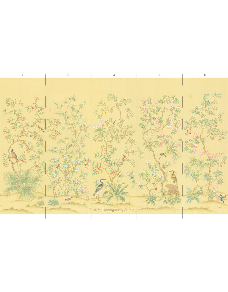 Dania tropical chinoiserie mural showcases colorful birds, tropical palms and blooming trees on a subdued yellow background. 5 Panels Available in Full Length/Headers/Footers, Sold in individual Panels, Width: 36", Design Height: 104" 108", Total Height: 92", Dania,Paul Montgomery Studios