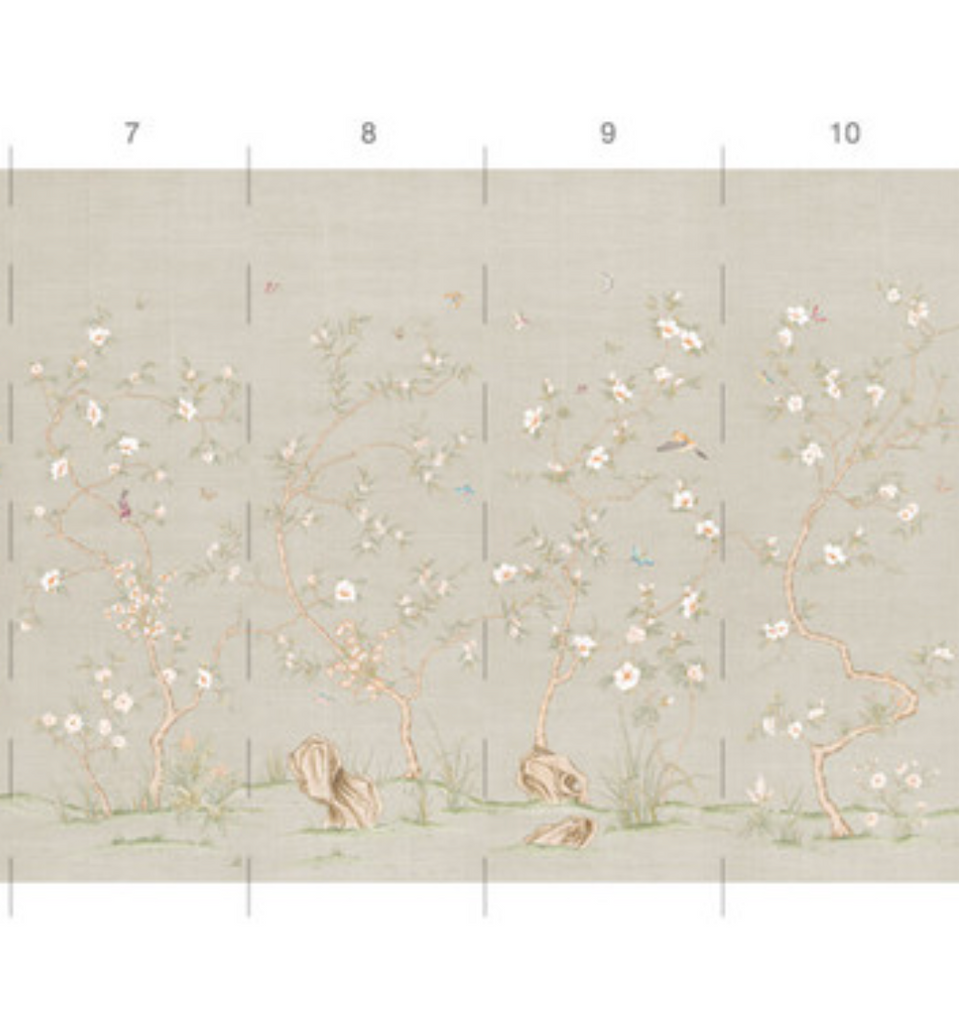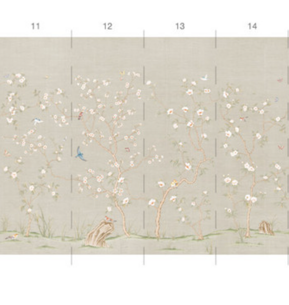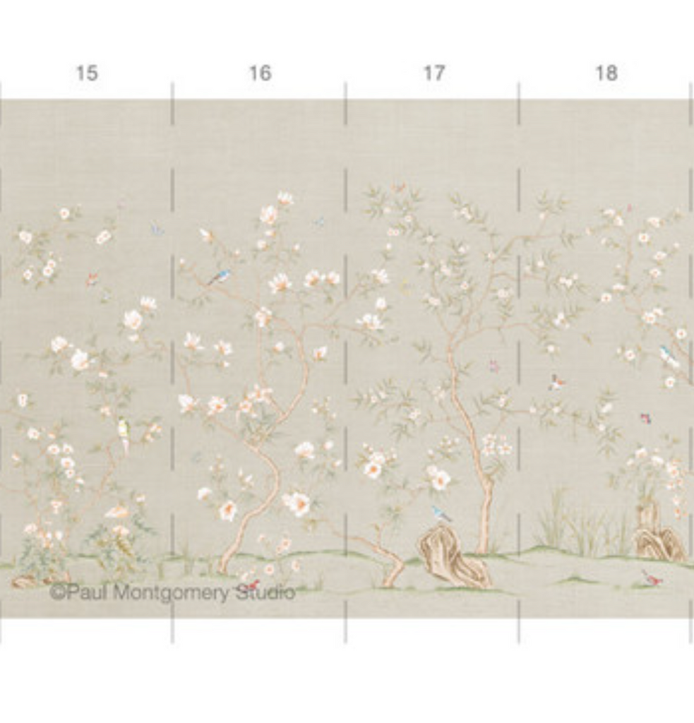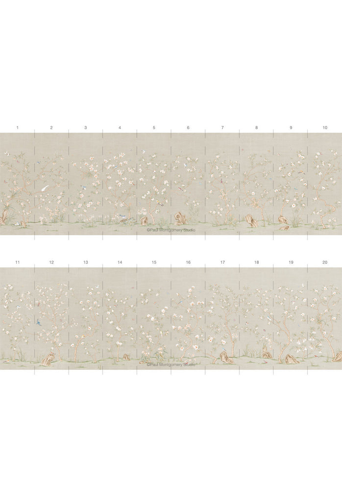 Fenimore is the mural that started it all. Ariel Okin's special color ways for this mural was the beginning of this amazing collection. These natural tones along with these classic chinoiserie styles create a fantastic theme for classic and modern spaces alike. Combined with its 9ft stature and 20 sprawling panels, this mural will create a beautiful, magnificent aura. Custom scaling and sizing available upon request. Samples available in the panel selection menu. Not sure how much product you need to order? Inquire about our Design Diagram service where we can take provided room measurements and determine how much paper is needed to get the best look. 20 Panels Available in Full Length/Headers/Footers, Sold in individual Panels, Width: 36", Design Height: 108", Total Height: 98", Fenimore,Paul Montgomery Studios