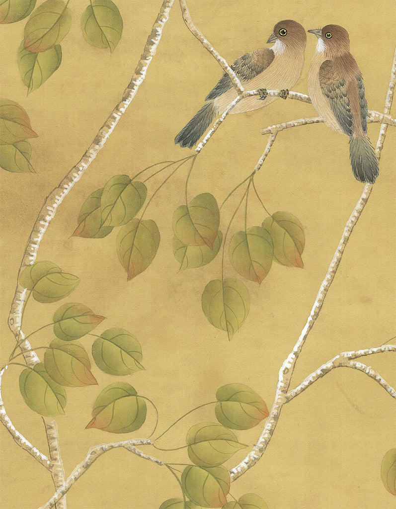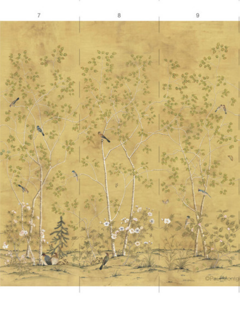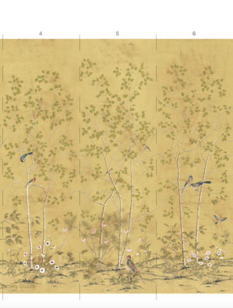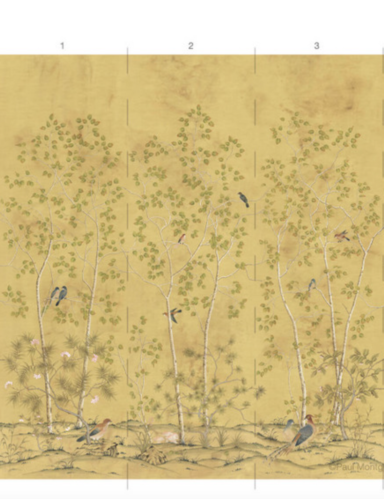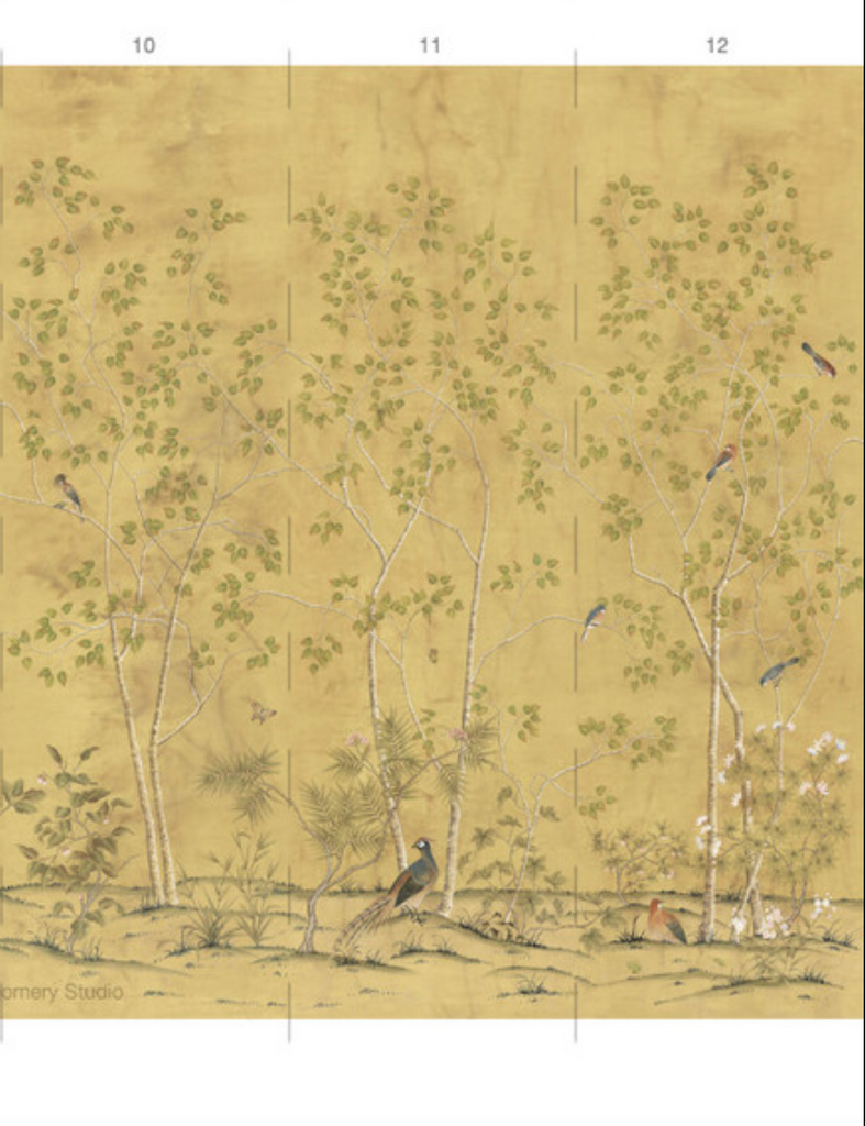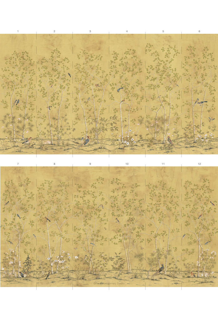 Our High Grove Antiqued chinoiserie mural is a scene with detailed pheasants and flying birds in a grove of white-barked Aspen trees. Aspen trees are not common in chinoiserie! 12 Panels Available in Full Length/Headers/Footers, Sold in individual Panels, Width: 30" 36", Design Height: 100" 120", Total Height: 110", High Grove Antiqued,Paul Montgomery Studios
