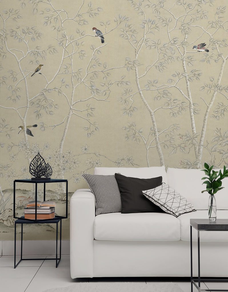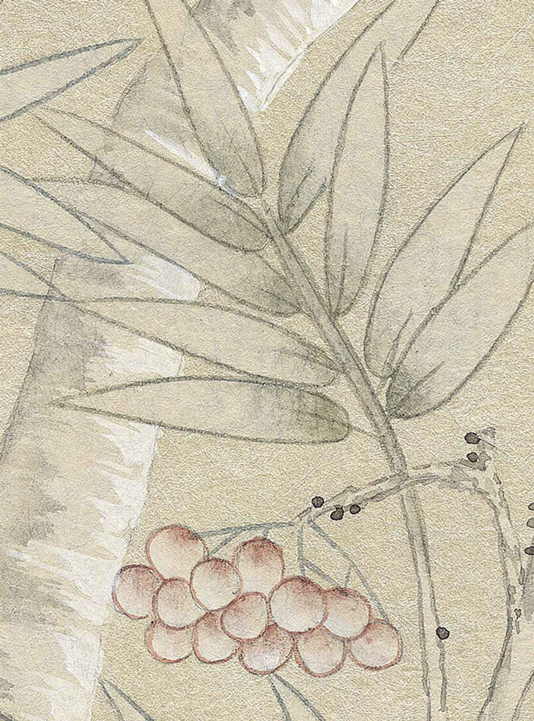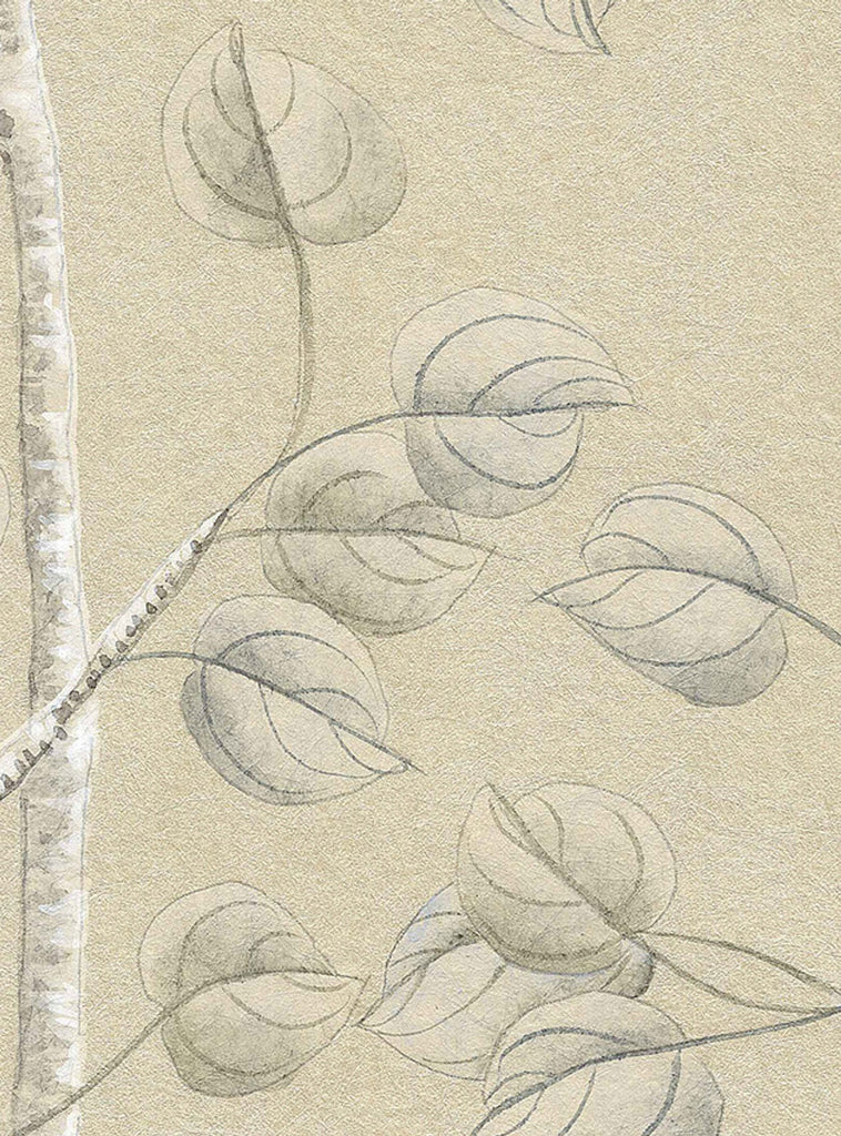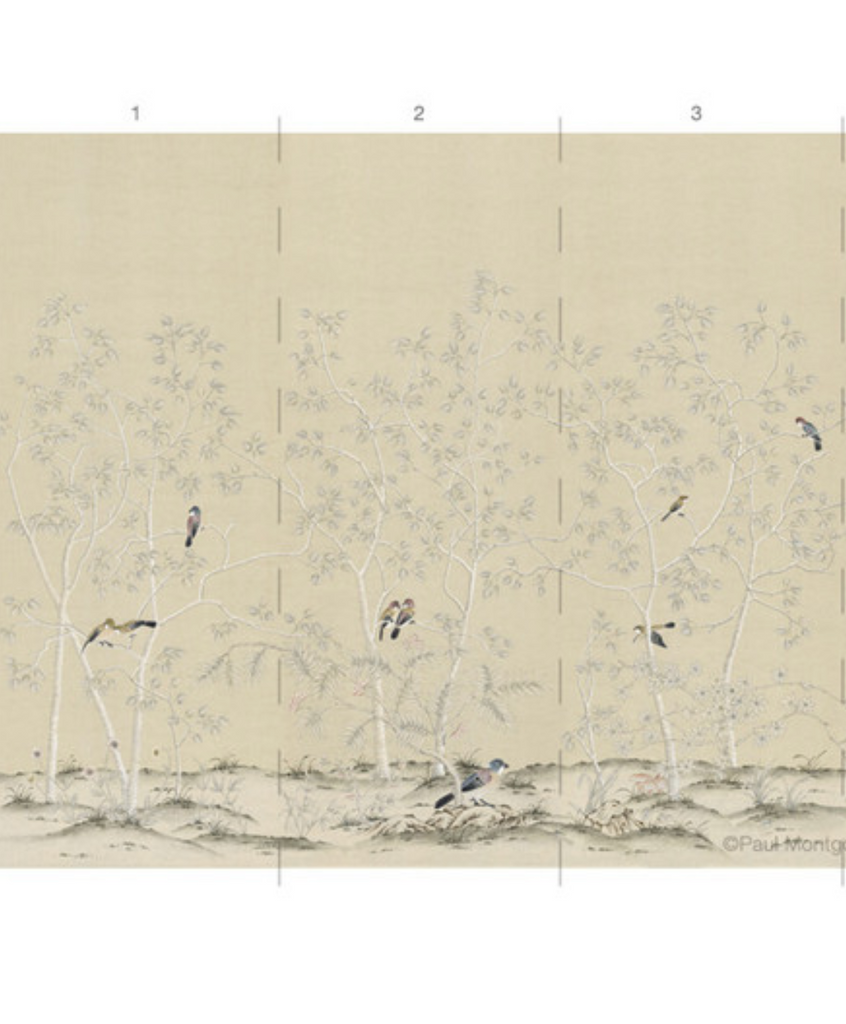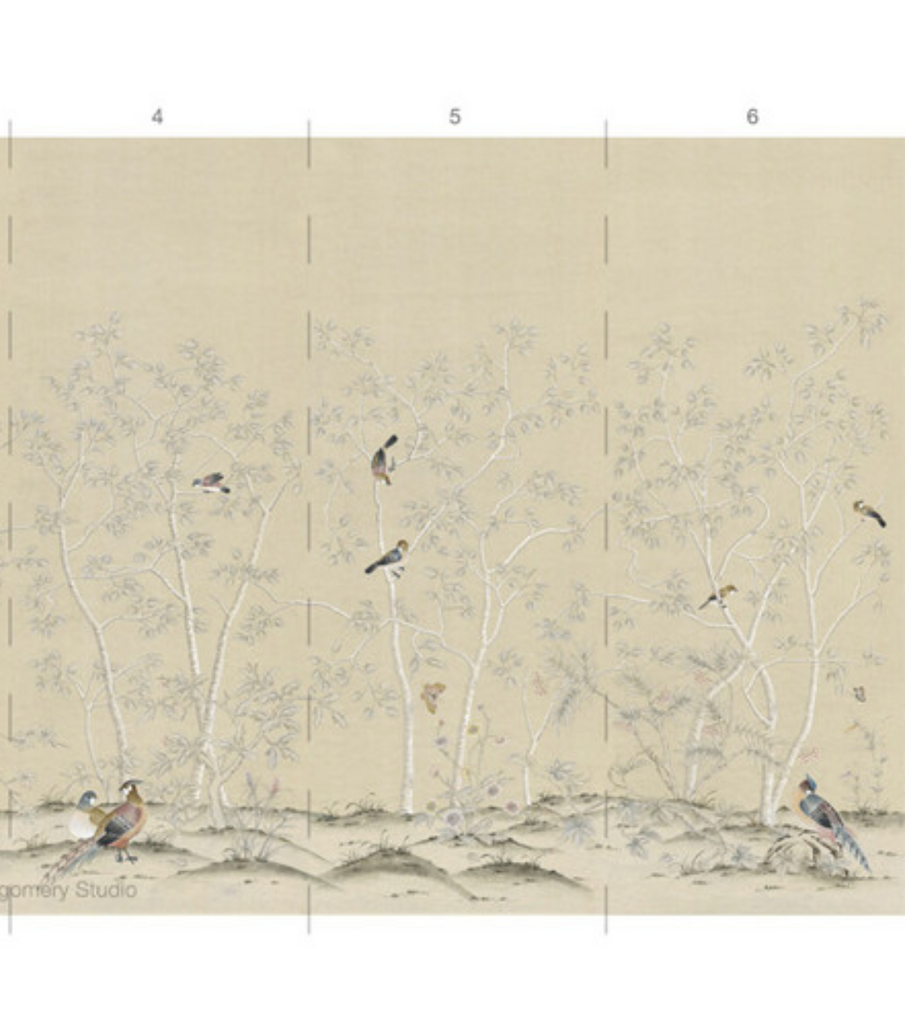 The High Grove Beige chinoiserie mural showcases colorful birds in a grove of unique white-barked Aspen trees. 6 Panels Available in Full Length/Headers/Footers, Sold in individual Panels, Width: 36", Design Height: 96", Total Height: 72", High Grove Beige,Paul Montgomery Studios