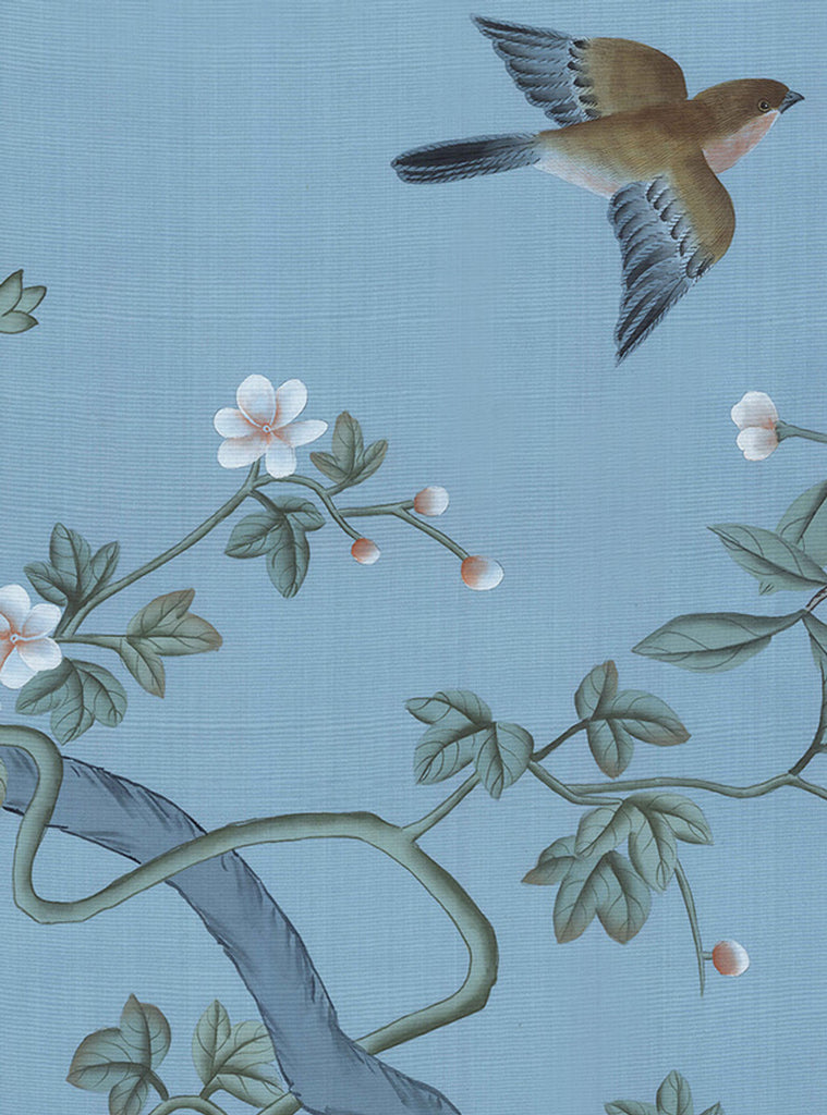 Jinan is a stunning chinoiserie mural in a rich blue color motif. The wallpaper features birds and fruit trees. 4 Panels Available in Full Length/Headers/Footers, Sold in individual Panels, Width: 36", Design Height: 108", Total Height: 84", Jinan Blue,Paul Montgomery Studios