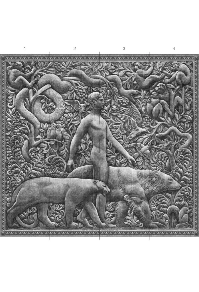 Kaa, a monumental design in silver metallic effect is a stylized rendition of an antique Art Deco masterpiece is printed on a beautiful metallic background, suitable for dry and wet areas, residential and hospitality. This Mural Source design can add visual interest or color to a bedroom, living room, or any room in your apartment or home; wall covering mural has various panels, patterns and modular elements for custom arrangement. The Kaa mural is a dramatic addition to any room. 2 Color styles available. Aegean (with grid) and Shadow (without grid), both on metallic silver. 4 Panels Available in Full Length/Headers/Footers, Sold in individual Panels, Width: 36", Design Height: 128" 132", Total Height: 128", Kaa,Paul Montgomery Studios