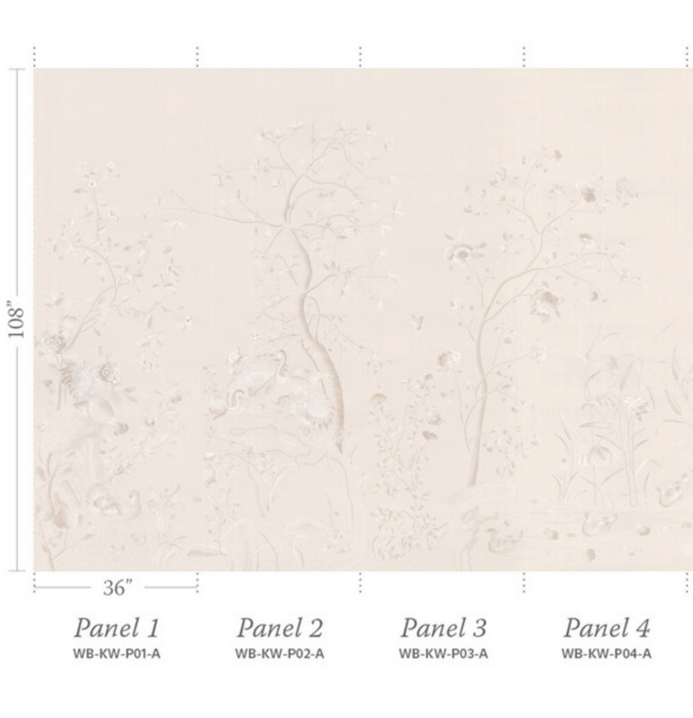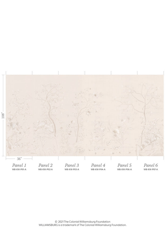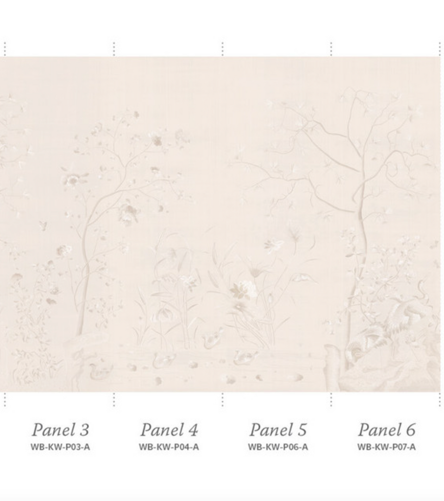 The Kensington Whitework mural is inspired by English whitework bed curtains embroidered in chinoiserie style around 1690-1730, and now in the Colonial Williamsburg collection. The curtains feature flowering trees springing from rocky mounds, ponds with wading birds, reeds, grasses, and flowers, all naturalistically arranged. The designs show the English fascination with Chinese style in that era of expanding world trade. Paul Montgomery’s team replicated the exquisite hand embroidery as part of the development of this mural, which is printed on six panels. Actual print does not include embroidery, only a visual replication. The inaugural WILLIAMSBURG Mural Collection X Paul Montgomery re-envisions the rich design archive of Colonial Williamsburg the world's largest living history museum, within a modern sensibility. Sales of WILLIAMSBURG products support Colonial Williamsburg's missions of education, preservation, and engaged citizenship – That the future may learn from the past. 6 Panels Available in Full Length/Headers/Footers, Sold in individual Panels, Width: 36", Design Height: 108", Total Height: 96", Kensington White Work,Paul Montgomery Studios