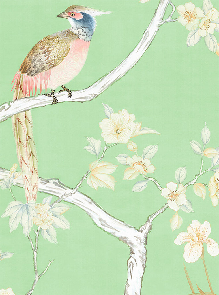 Lavena depicts whimsical trees, a brightly feathered pheasant and petite birds. Design is available in seven color themes. Panel 3 matches to panel 1 to allow the scene to repeat around a room. 3 Panels Available in Full Length/Headers/Footers, Sold in individual Panels, Width: 36", Design Height: 108", Total Height: 96", Lavena,Paul Montgomery Studios