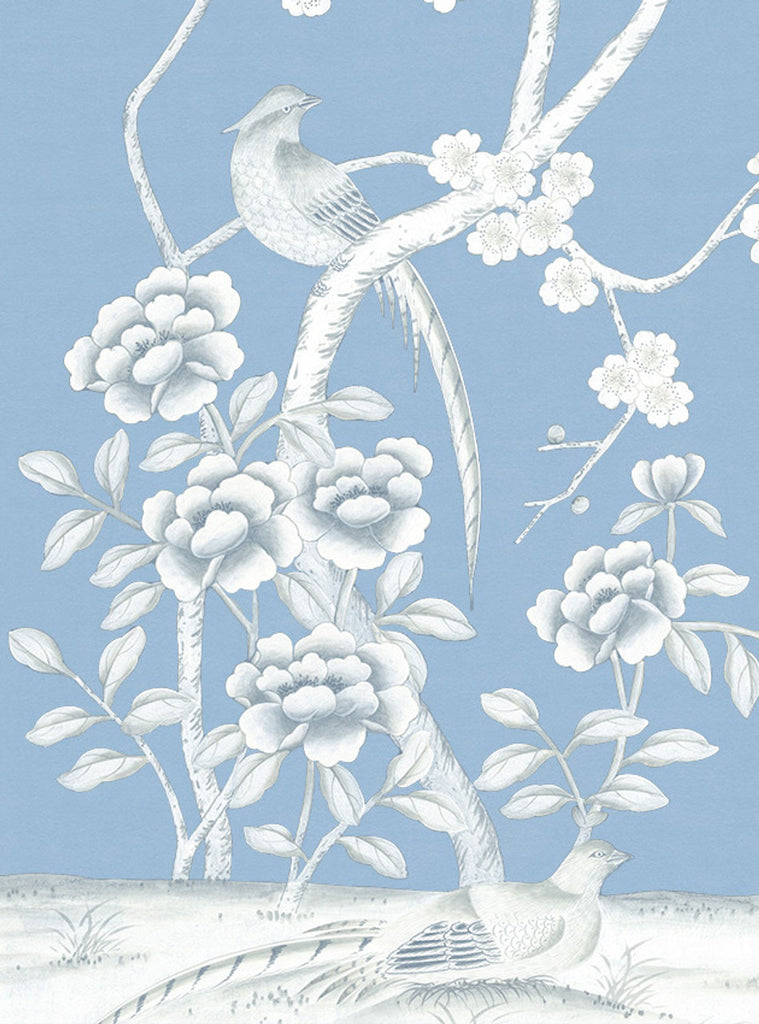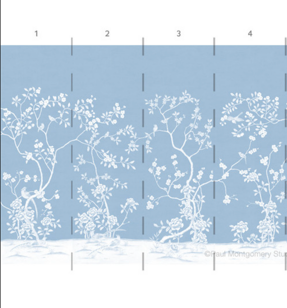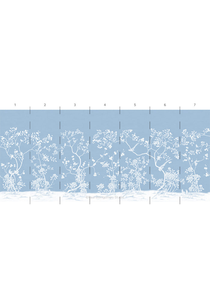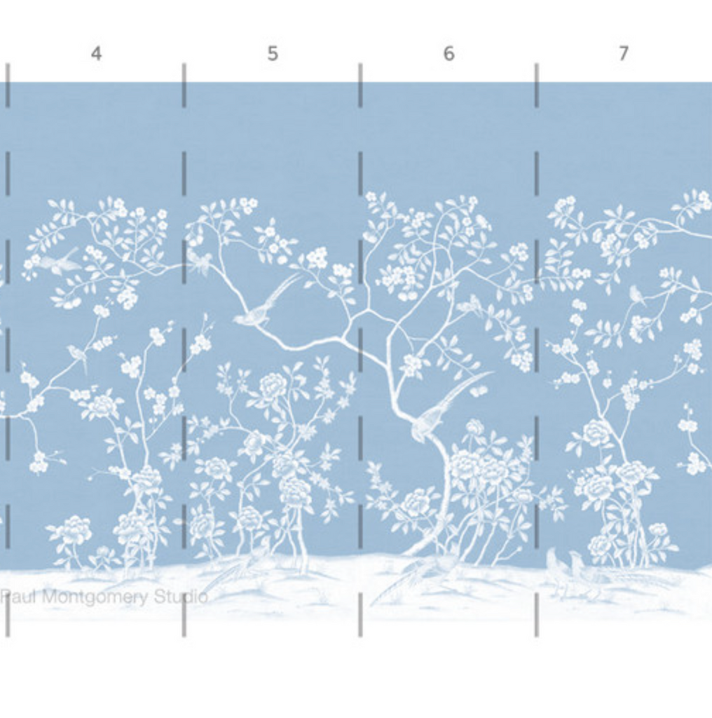Maysong Charcoal is a beautiful chinoiserie mural with large white blooms on a dark grey background. 7 Panels Available in Full Length/Headers/Footers, Sold in individual Panels, Width: 36", Design Height: 96", Total Height: 89", Maysong Charcoal,Paul Montgomery Studios