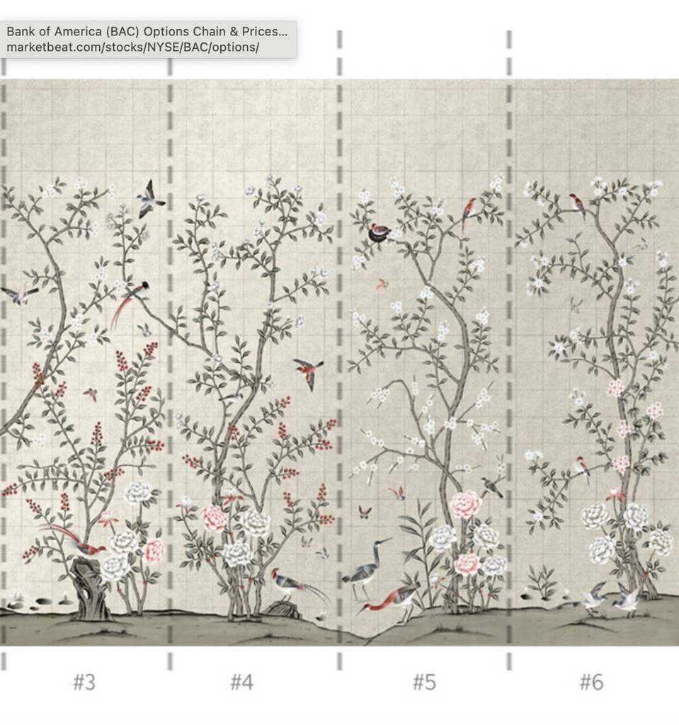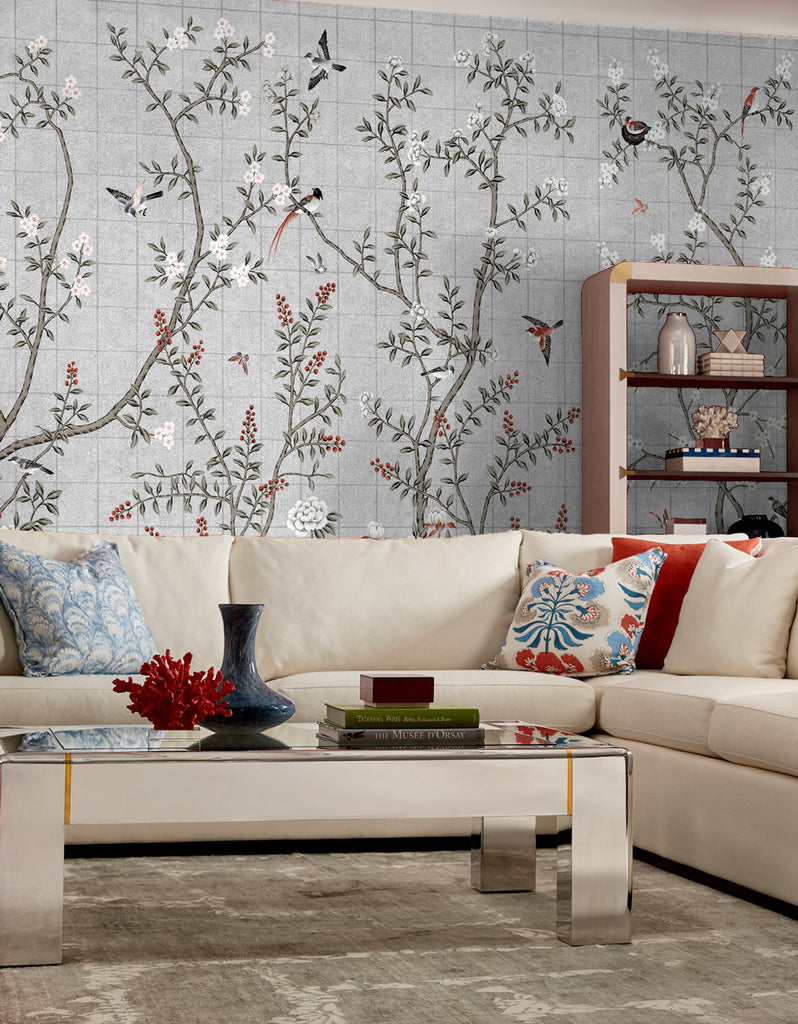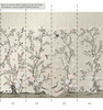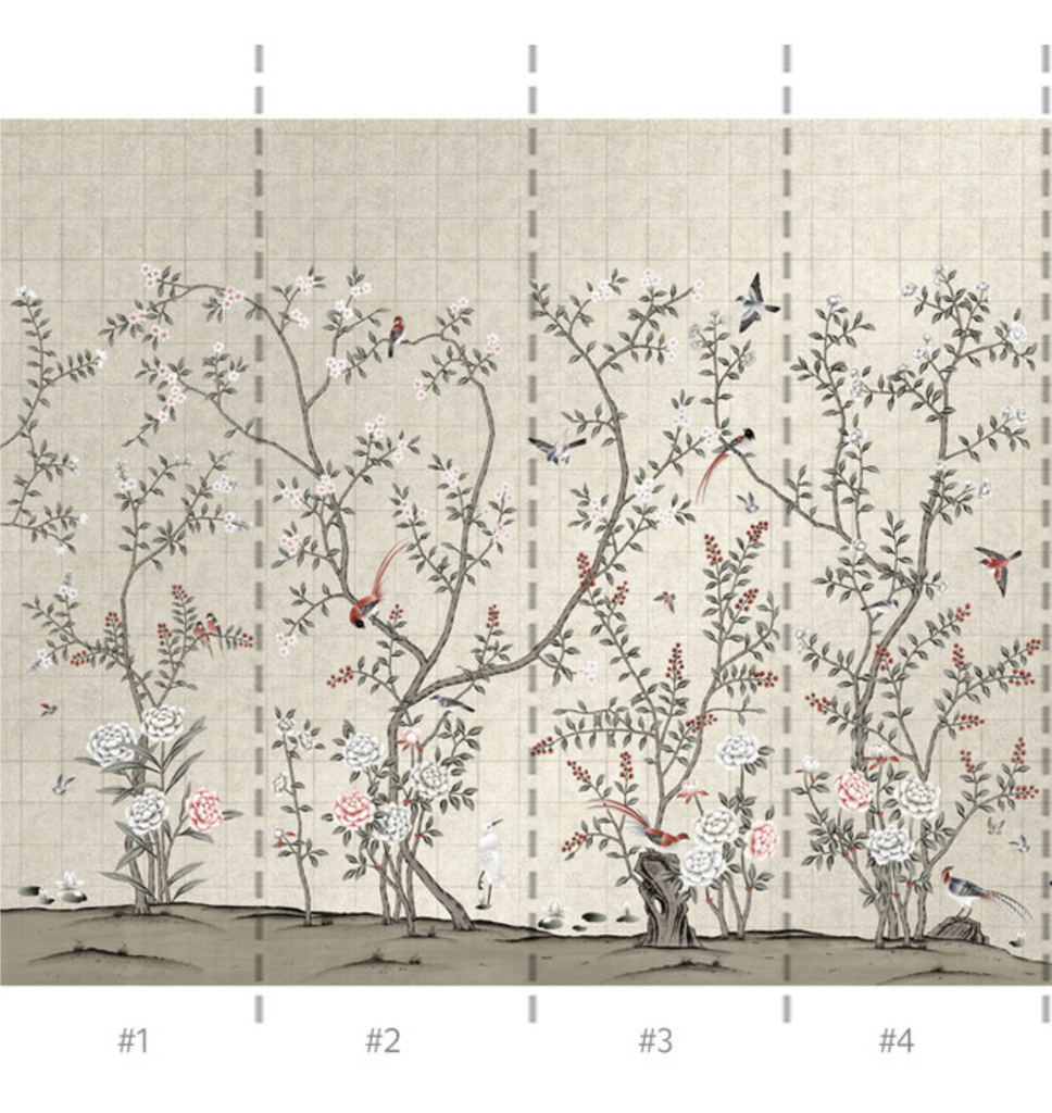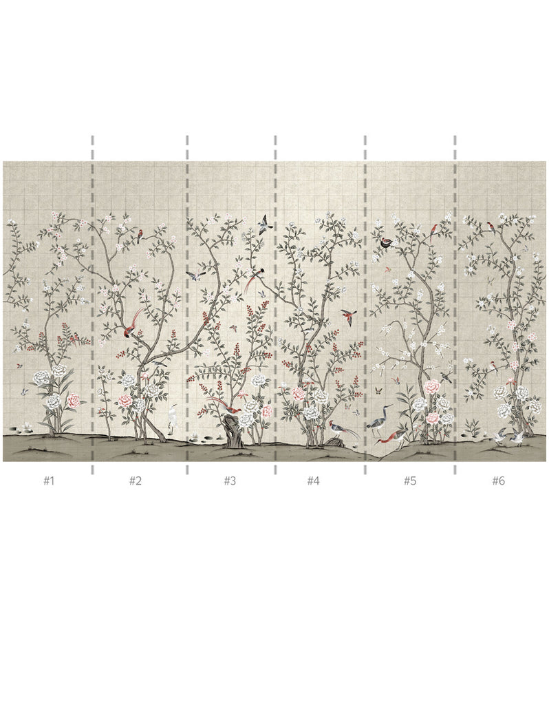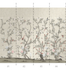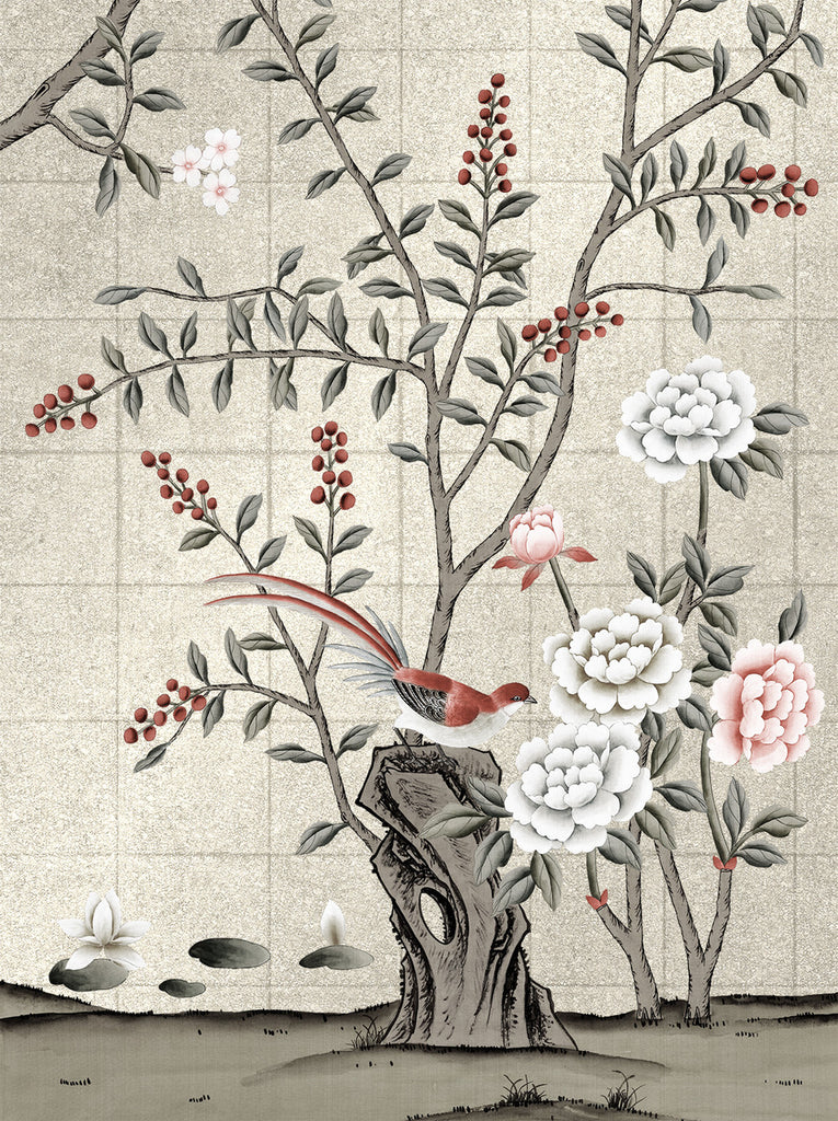 Nanjingis a chinoiserie mural featuring a golden scene with pastel peonies and colorful birds gathered around a peaceful pond. 6 Panels Available in Full Length/Headers/Footers, Sold in individual Panels, Width: 36", Design Height: 120", Total Height: 98", Nanjing Silver,Paul Montgomery Studios