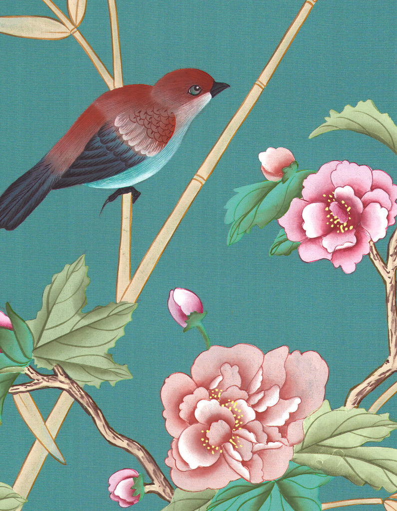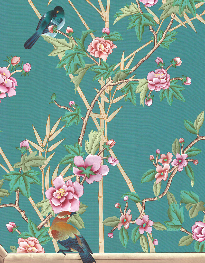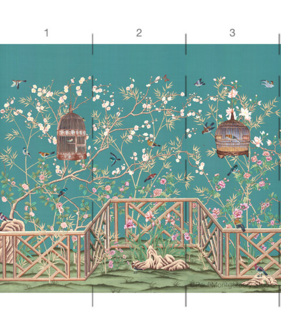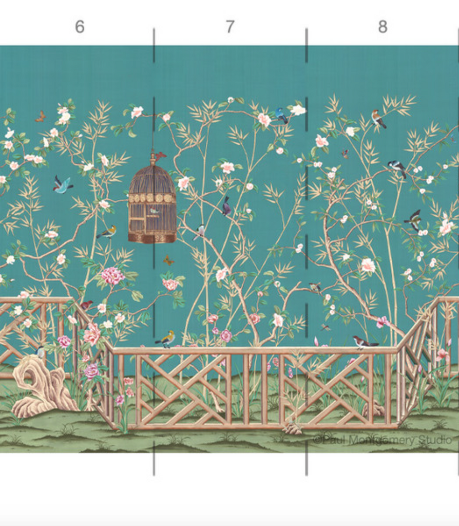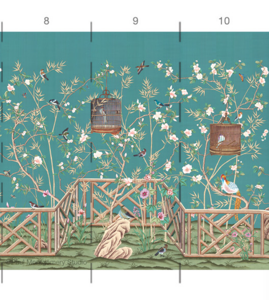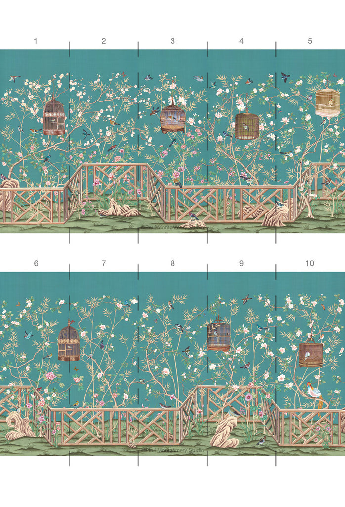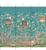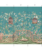 Otley Park is a sophisticated chinoiserie mural with a handsome Chippendale fence motif. The colors are bright in the setting of an aqua-blue background. 10 Panels Available in Full Length/Headers/Footers, Sold in individual Panels, Width: 36", Design Height: 96", Total Height: 84", Otley Park,Paul Montgomery Studios