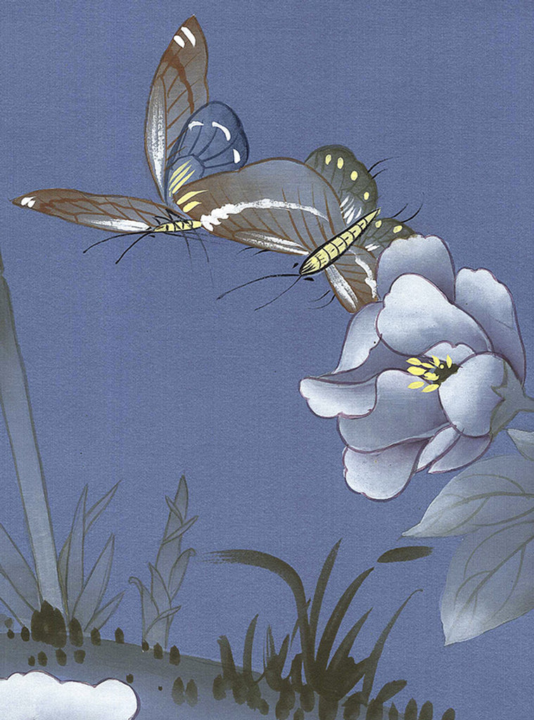 Palace Garden is a chinoiserie mural displaying a scene with subtle colors, showing large blooms and flying birds on a warm, rusty-beige background. 7 Panels Available in Full Length/Headers/Footers, Sold in individual Panels, Width: 30" 36", Design Height: 100" 114", Total Height: 108", Palace Garden Blue,Paul Montgomery Studios