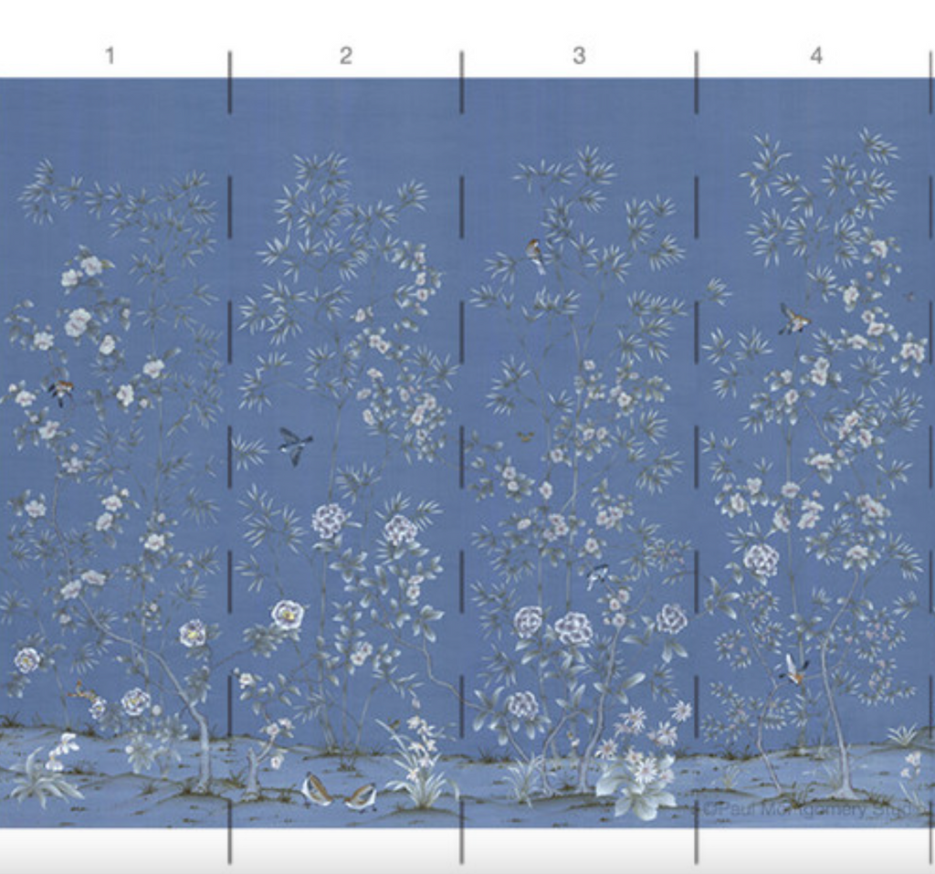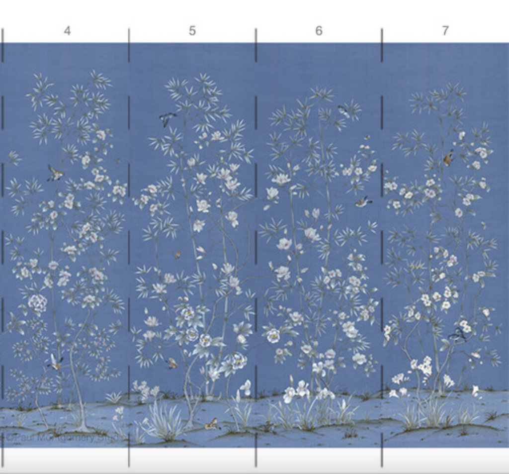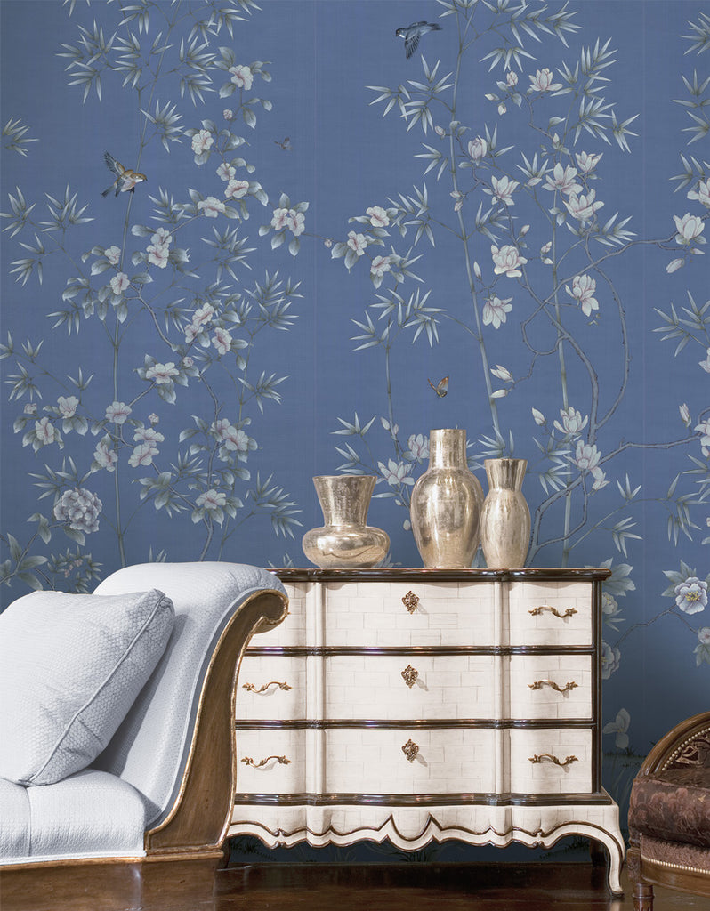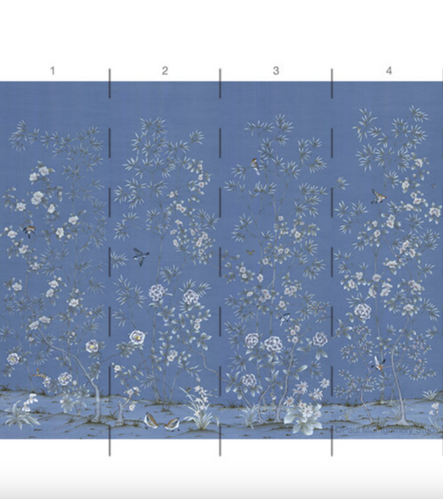 Elegant mural featuring a serene garden scene in calming blue hues by Paul Montgomery Studios. Perfect for adding timeless charm and tranquility to any space. #luxurywalls #decorativepanels #artisticinteriors