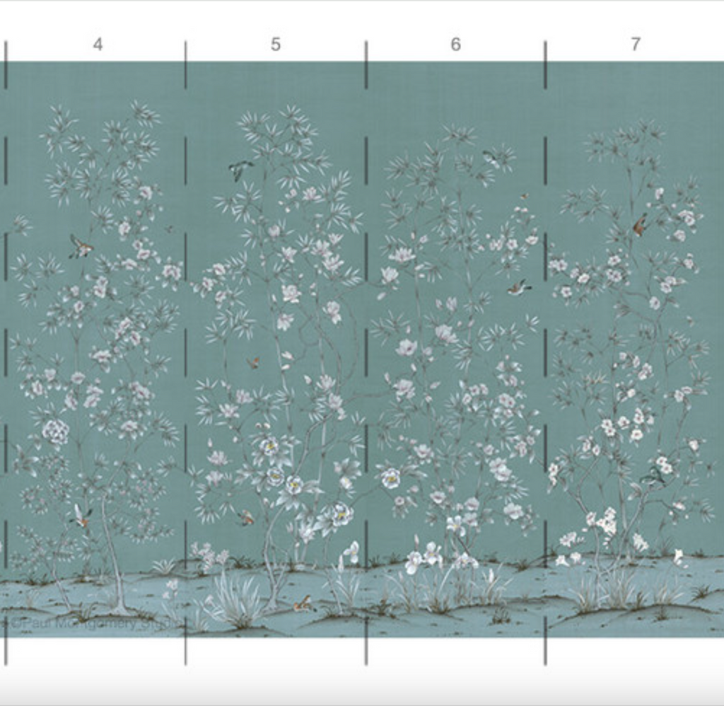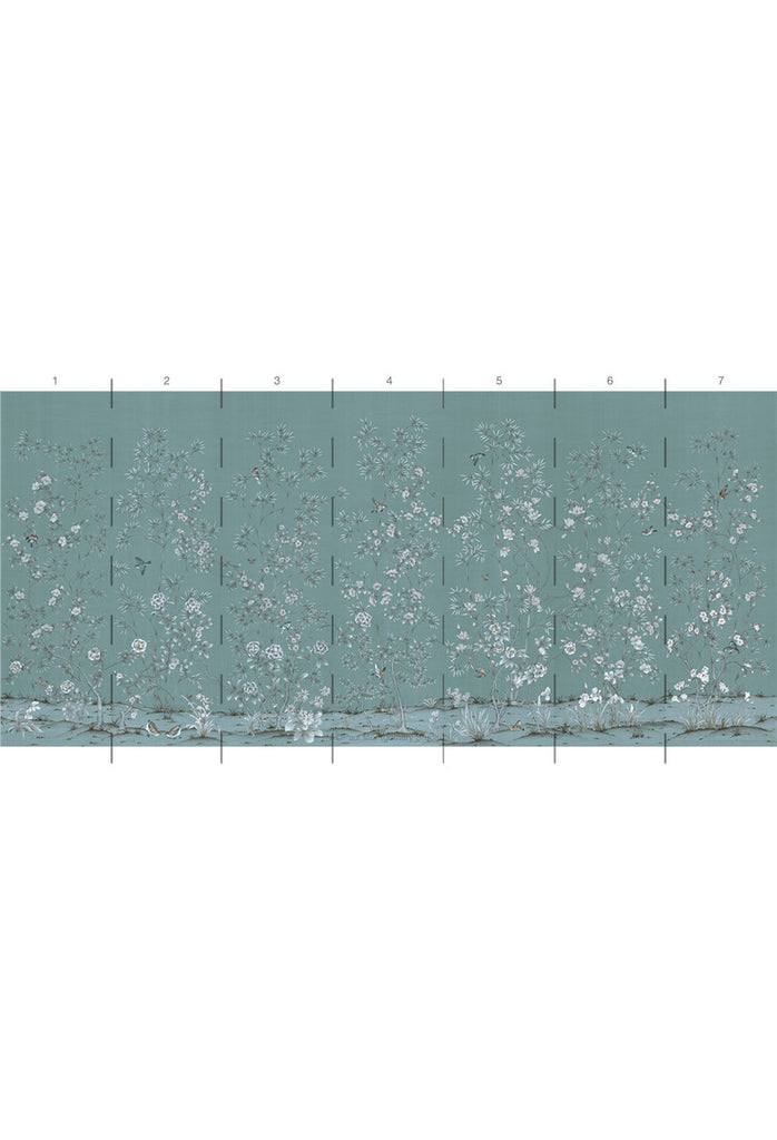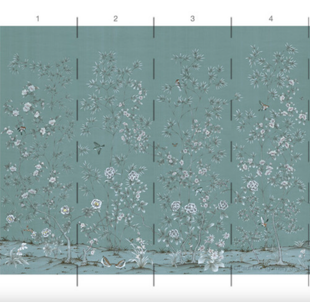 Palace Garden is a chinoiserie mural displaying a scene with subtle colors, showing large blooms and flying birds on a warm, rusty-beige background. 7 Panels Available in Full Length/Headers/Footers, Sold in individual Panels, Width: 30" 36", Design Height: 100" 114", Total Height: 108", Palace Garden Blue,Paul Montgomery Studios
